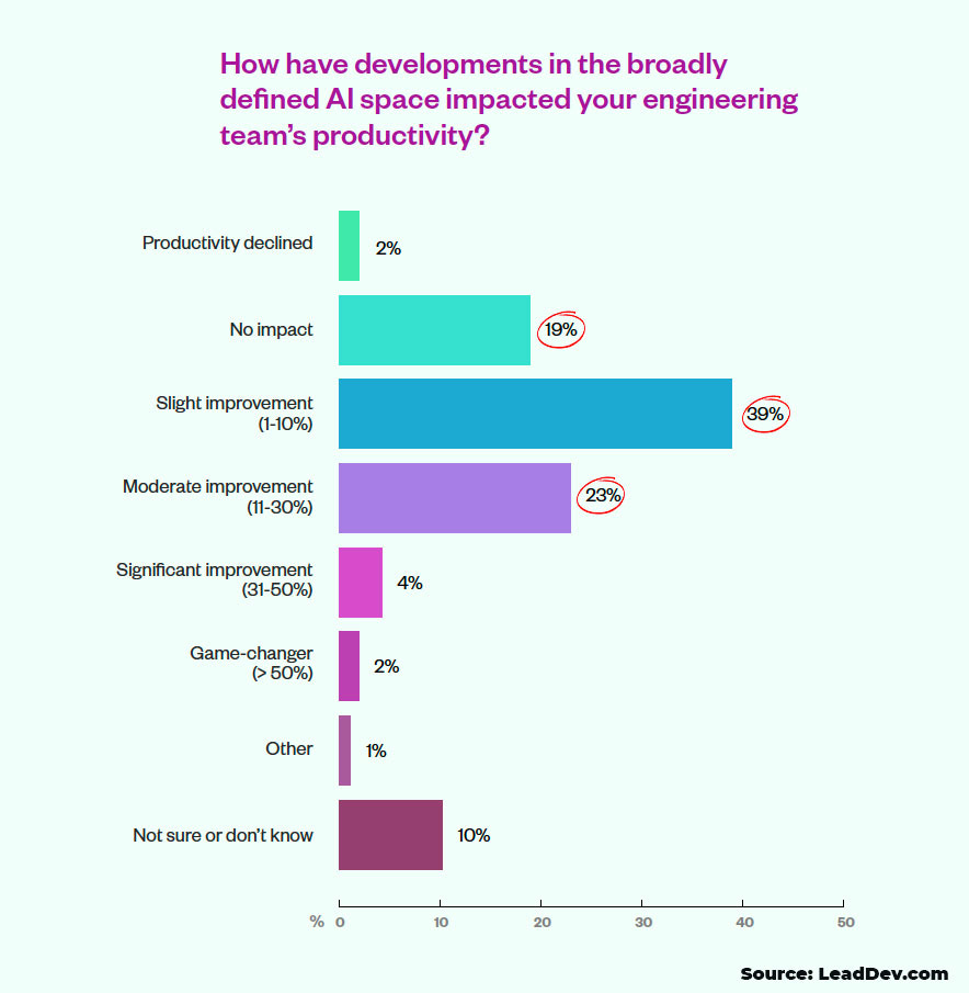 If your team is scaling APIs, or just tired of wasting time and money on debugging mysteries, this keynote recap is well worth a look. Thanks to Postman for sponsoring this newsletter, let’s get back to this week’s thought! Intro60% of engineering leaders believe that AI has not significantly boosted their team’s productivity. This has been an interesting insight from the 2025 Engineering Leadership report done by LeadDev, that I’ve closely looked at. Some other interesting numbers:
