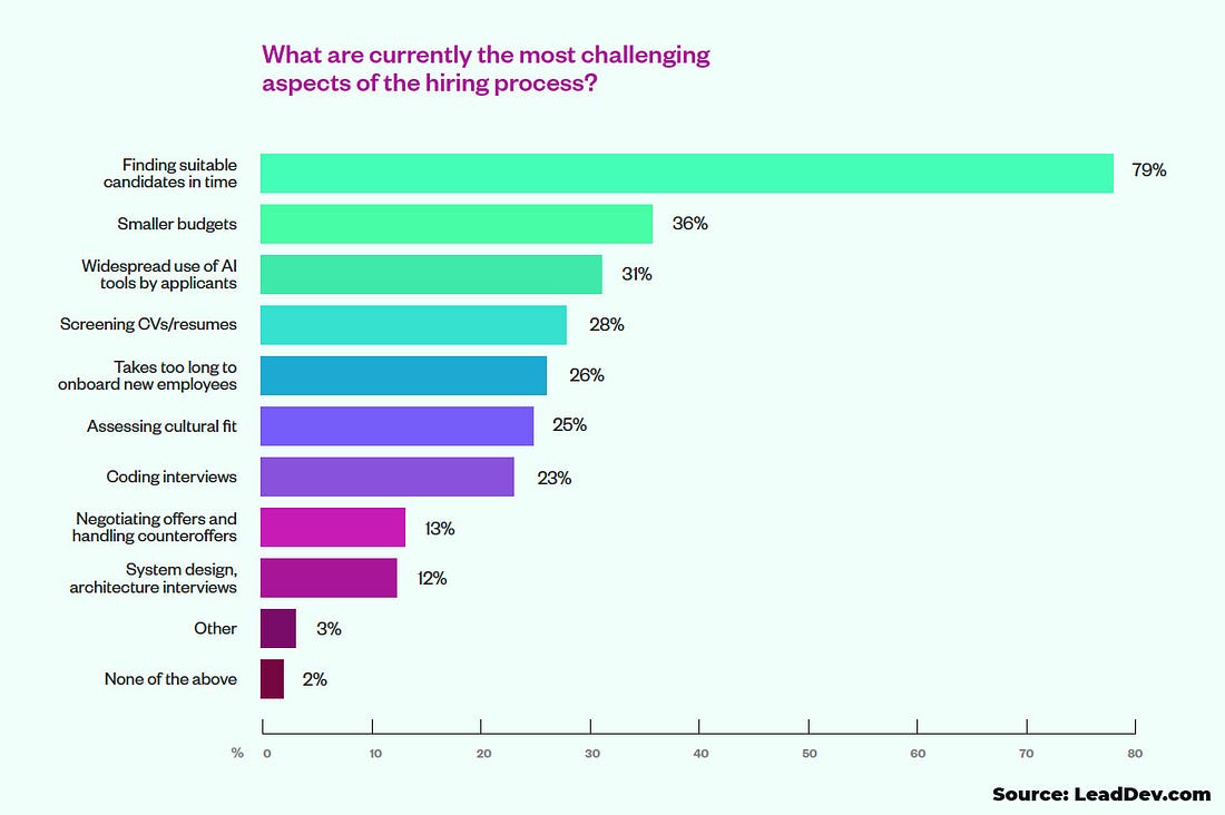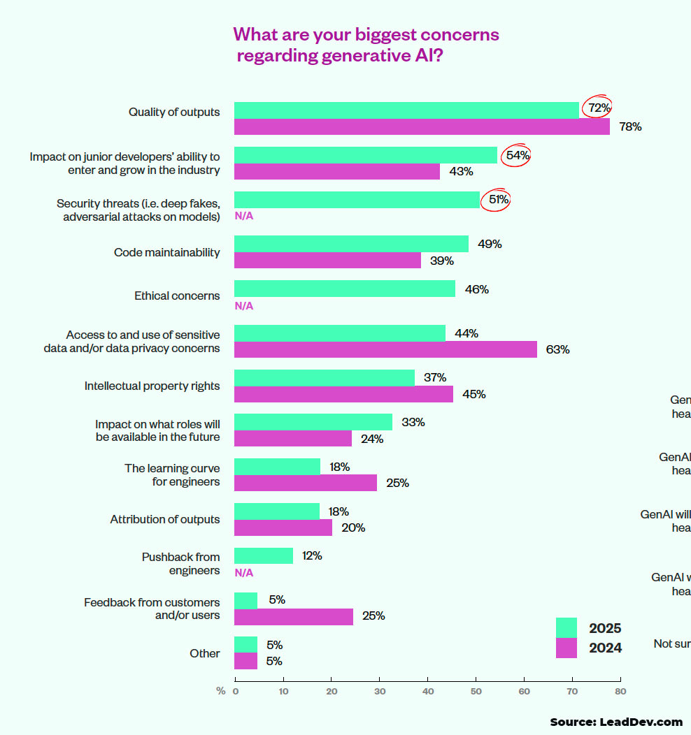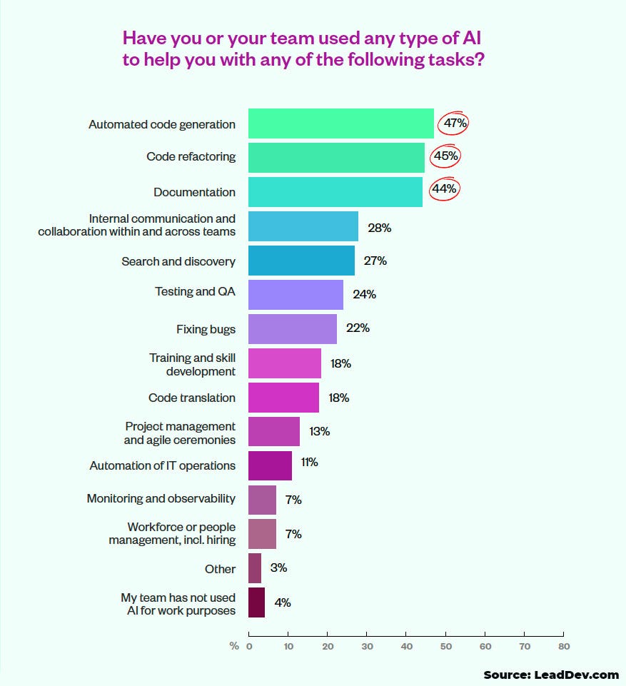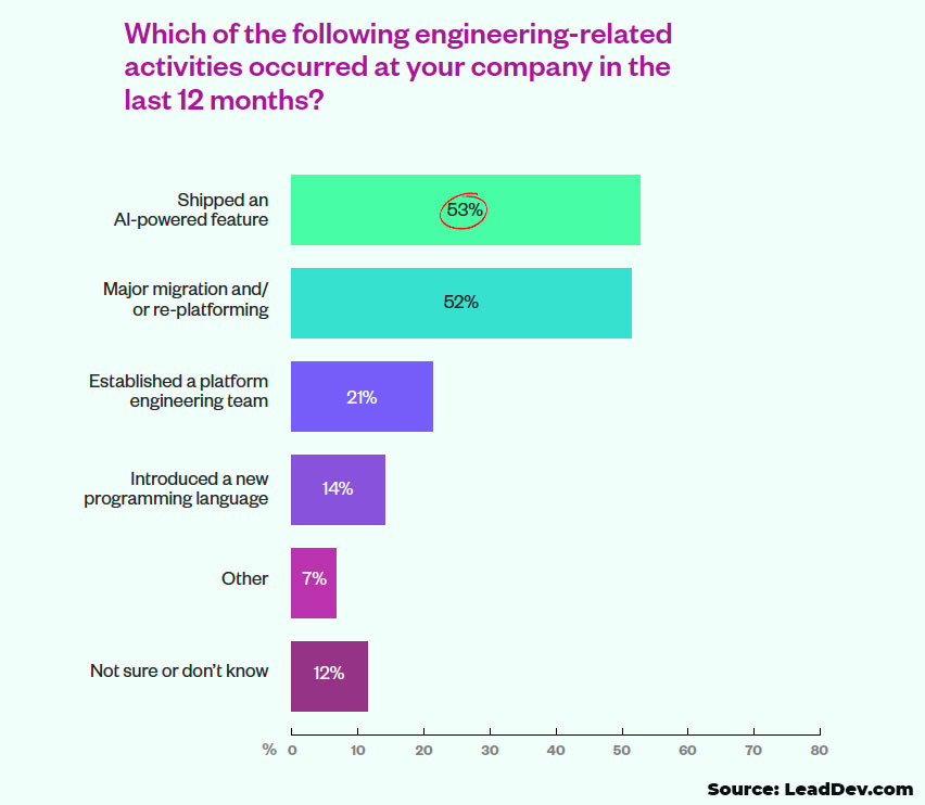 3. The impact of AI on engineering leadership3.1 Shipping AI-powered features being the most common activityFollowed by Major migration and/or re-platforming. This is not surprising at all, since a lot of companies are re-branding themselves to be AI companies and also a lot of companies have FOMO with AI and want to make sure they are not missing out. In my opinion, this may be the issue with a lot of companies → as “just adding some AI” to the product or doing a complete re-branding may backfire. Instead, I recommend focusing on solving actual business challenges regardless of whether that is an AI feature or not. 3.2 AI coding tools are the most popular focus area for engineering organizationsThis definitely makes sense as we have seen that Cursor is one of the most popular AI coding tools right now and a lot of engineering leaders have seen an increase in productivity by using it. We did a deep dive on Top AI coding tools here: 3.3 Automated code generation, code refactoring and documentation are the most common use cases for AIThis is not surprising at all, but it’s a good insight for many companies to know in which specific parts they can expect to get benefits from using AI. We’ve mentioned specific cases for all 3 main activities in the article: How to use AI to increase Software Development productivity. 3.4 A lot of engineering leaders believe that AI hasn’t significantly improved the engineering team’s productivityThis is an interesting insight, as we have seen in the article How to use AI to increase Software Development productivity that in specific cases AI has improved productivity a lot, but in others not at all. I can definitely relate to the results as there are many unknowns and especially in mid+ size companies the process might not be that good or there are security issues, so it’s harder to integrate AI workflows. 3.5 Quality of outputs being the biggest concern regarding generative AIThis definitely makes sense, but also we can see that the quality of outputs has improved in comparison to 2024. And also the data below is confirming what we mentioned before → decrease of Jr. engineer roles. And another threat came recently → we’ve seen people trying to cheat with AI on interviews. If you haven’t read the article on how to design your interview process against AI cheating, you can find the article below: 3.6 Engineering leaders are quite optimistic regarding AI impacting headcountThis is a bit surprising especially since the narrative in Big Tech is “Increase the productivity while having fewer people”, but this is very promising in terms of how engineering is going to look in the future and how many jobs are going to be available. I personally certainly see a bright future for proactive people who focus on building both human-related skills and pure problem-solving abilities. Learn more about how to do that here: Last wordsLet’s end this article with the following: