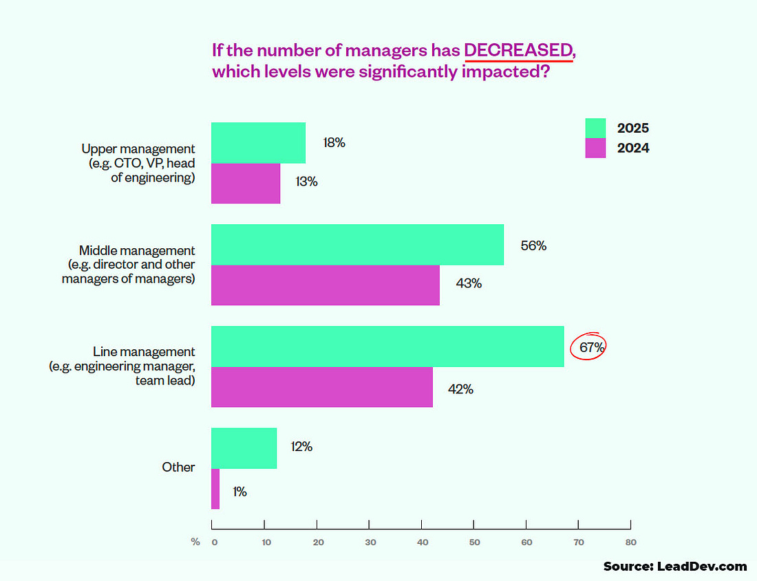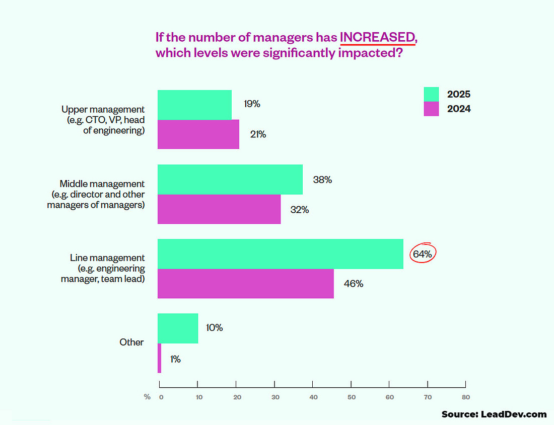 These are both signs that the state of engineering organizations is improving. Less uncertainty and increase in hiring. Also, an important trend that we recently broke down is the decrease of entry tech roles, while we saw an increase in mid+ level roles. What is also interesting to see is that remote or hybrid work has seen a decrease in 2025 in comparison to 2024. 1.2 Line managers (Engineering Manager, Team Lead) impacted the most → both positively and negativelyWe saw a continuous trend of companies trying to flatten their organization in 2024, but an interesting insight here is that a lot of companies are actually looking to increase their managerial roles.