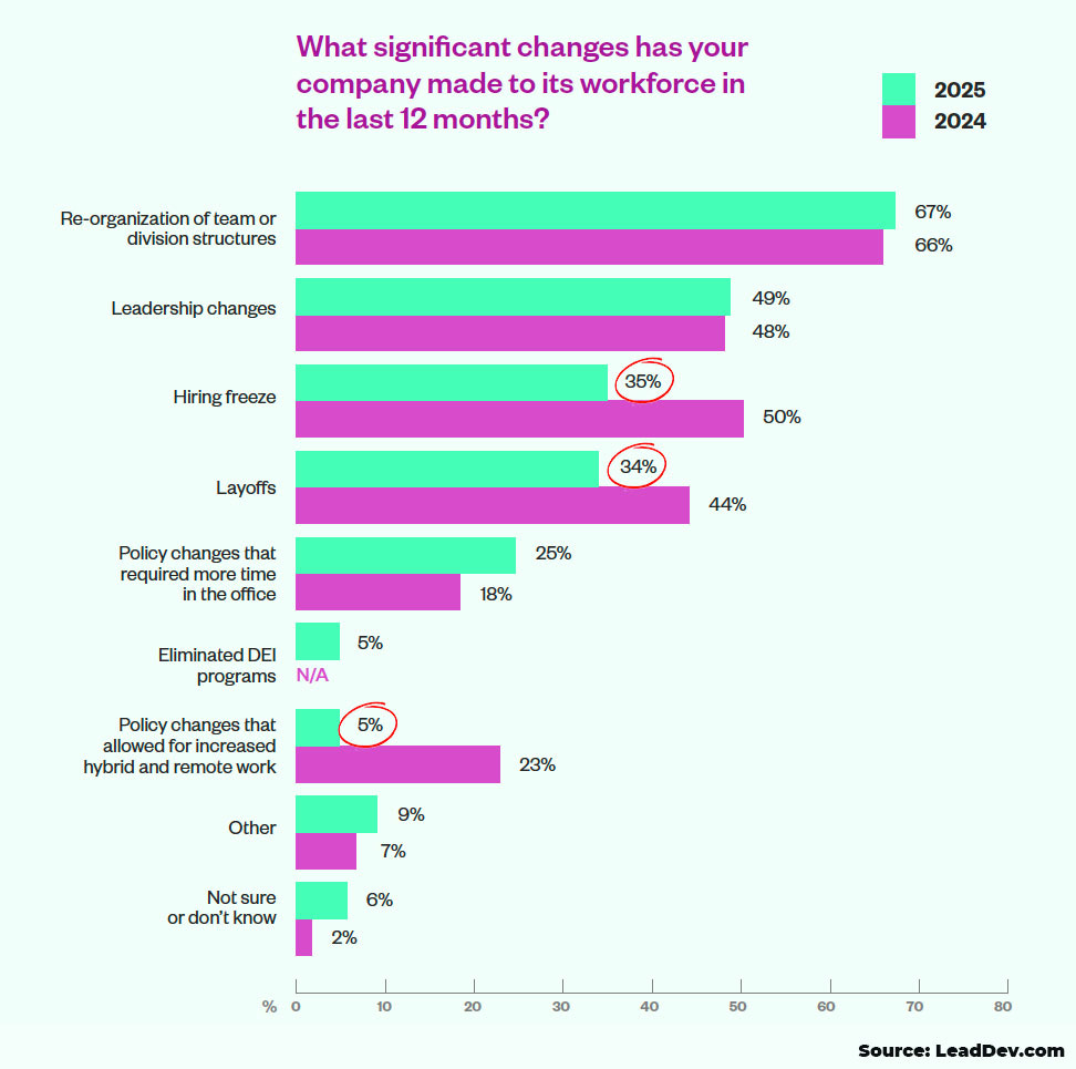 I am sharing the most interesting insights from the report and my thoughts on the data. The survey was conducted between 14–27 March 2025 and is based on 617 respondentsHere are the full demographics: Now, let’s get to specific insights. 1. How engineering organizations are changing1.1 Improved hiring and layoffs while a decrease in hybrid/remote work2024 has been a year that we will remember for its numerous layoffs and hiring freezes. Based on the data we can see that this has improved quite a bit in 2025.
