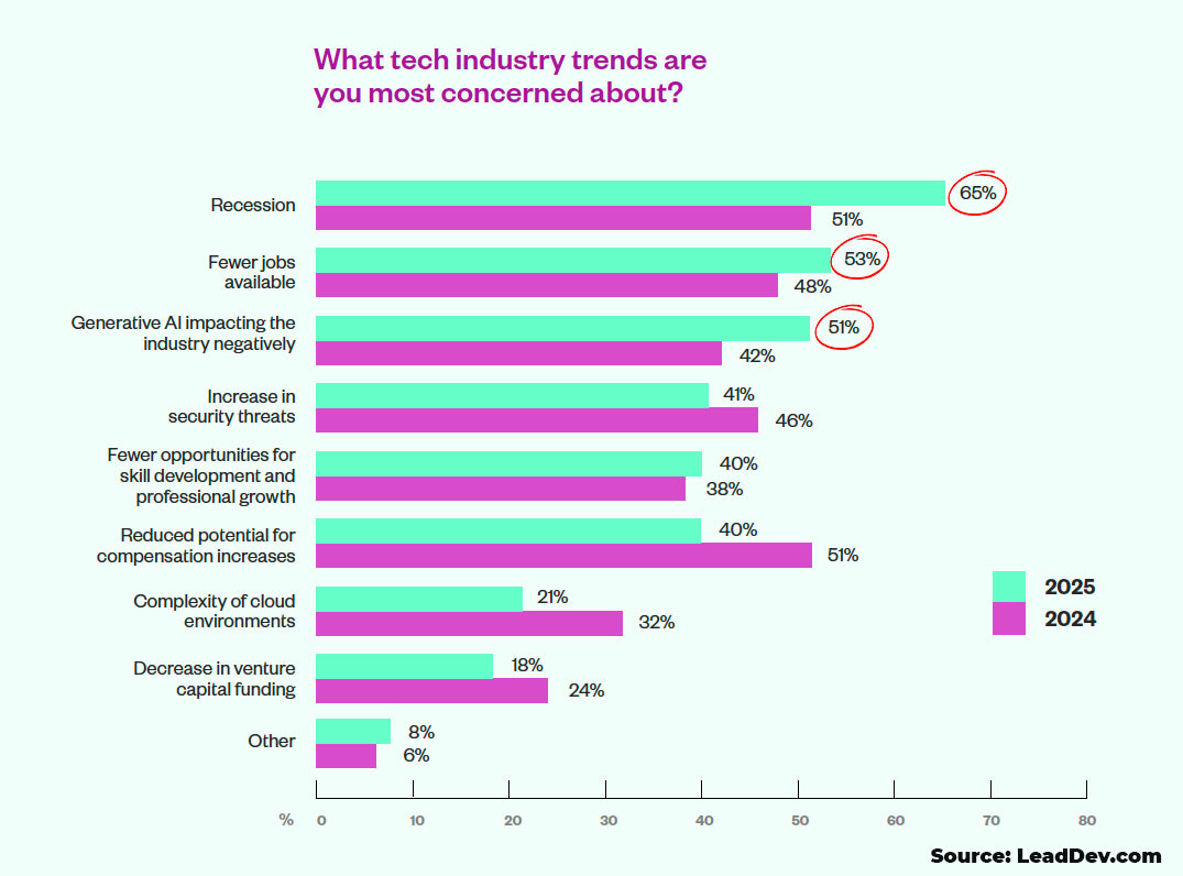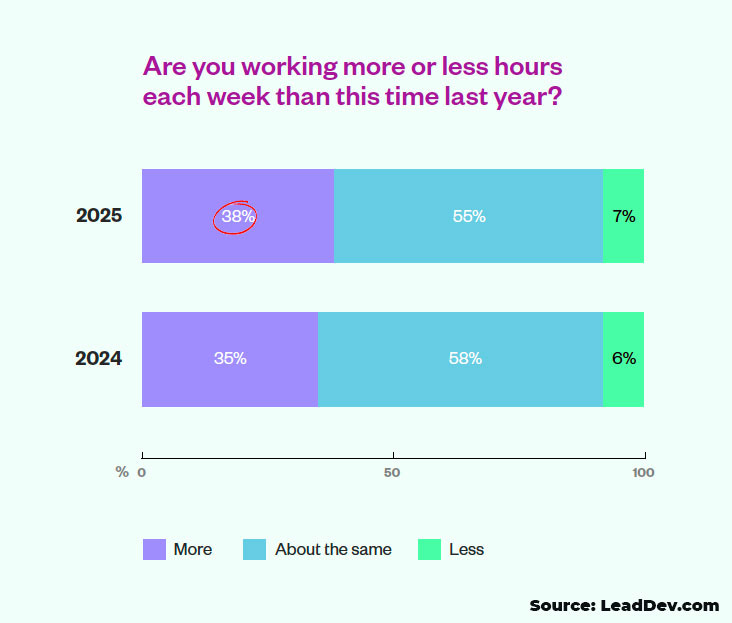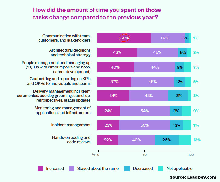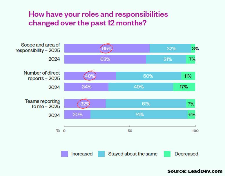 And both decrease and increase are the most associated with line managers, which is very interesting. 1.3 51% of engineering leaders believe that AI is impacting the industry negativelyWe can see an increase in engineering leaders believing Gen AI is impacting the industry negatively, from 42% (2024) to 51% (2025). I think the reason is just too many unknowns. These two articles help to give more insights on how to use AI effectively both as an engineering leader and also in teams: And also the two interesting insights here are that a lot of people believe the recession might be coming soon (65%) and also an increase in Fewer jobs available from 48% (2024) to 53% (2025). 1.4 The biggest hiring challenge is to find suitable candidates on timeThis is a bit ironic, as many people are looking for roles, but a lot of engineering leaders report that it’s a challenge to find suitable candidates within a certain timeframe. I believe one of the issues for this is the increase of the expectations for candidates with a combination of smaller budgets. 2. What it's like being an engineering leader in 20252.1 Increase of responsibilities, number of direct reports and teamsWe can see the increase in all 3 areas, especially prominent in having more teams reporting to an engineering leader and also an increase in the number of direct reports. 2.2 Engineering leaders are working longer hours than everSince the scope and number of direct reports have increased, it makes sense that people reported also longer hours as well. 2.3 Good communication is one of the most important skills for engineering leadersWe can see that this is true from the data below. There has been an increase in the need for good communication in 2025. We have predicted that in the article: Definitely recommend reading the article above to ensure you focus on the right set of skills to be successful as an engineering leader in 2025 and beyond. 2.4 Most engineering leaders are not considering going back to being individual contributorsEspecially as the more they grow in their roles, the less it’s being considered. I definitely recommend staying technical though, as it’s important in order to be able to do the engineering leadership role effectively. 2.5 Maintaining motivation in teams is becoming a bigger challengeI think one of the biggest issues for this is that there are so many unknowns on how AI is going to change the engineering landscape. Also, everyone in Big Tech giving bold predictions doesn’t help with that. We’ve debunked some of the false promises given by some of the bigger companies here: 2.6 Burnout is rising among engineering leadersThis is a bit concerning as I see 12% of engineering leaders mentioning being emotionally drained from work every day following up with 20% mentioning a few times a week.