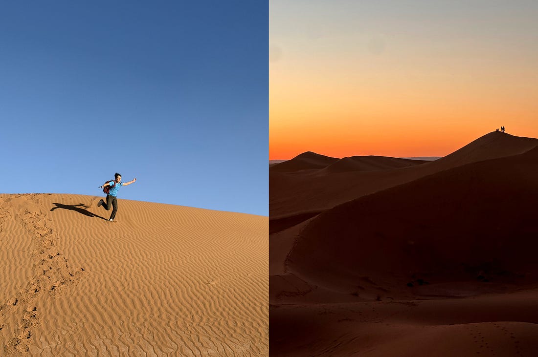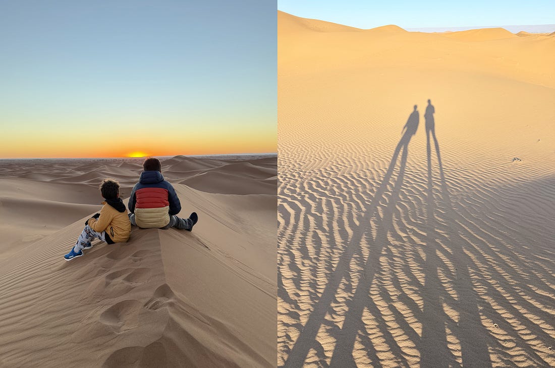 Too often, we pause. And we wait for someone else to make something happen for us. Nearly a decade ago, Lauren Adams Lenz was speaking to the design team at Meta. She was sharing the story of her career path and how she had wanted to become a manager. She had shared this goal with her manager, brought it up each quarter, and waited for an opportunity that just wasn’t materializing. Most of us would have gotten frustrated. We might have blamed our manager for not supporting our growth, assumed they didn’t believe in us, or started looking for a different role, on a different team, with a different manager. But Lauren didn’t do any of that. Instead, she had a profound realization: her manager just had other priorities. He wasn’t neglecting her growth or doubting her abilities. But he also wasn’t staying up at night thinking about how to make her a manager. She didn’t blame him for that. But she did stop waiting and made becoming a manager her priority. She figured out what needed to be done, what skills she needed to demonstrate, and what experiences she needed to build. She had a few very clear, specific asks of her manager. And she did the work to get there. This lesson applies far beyond careers. Our priorities aren’t automatically anyone else’s priorities. So at some point, we have to seize ownership of what we want and act on it. At the very end of 2025, I finally did that. I manifested a dream that had been sitting with me for nearly twenty years: I made it to the Sahara desert. When my husband and I started dating in 2006, he had recently organized a trip with friends through Morocco and into the Sahara. His photos of the vast landscape of sand dunes planted a vision in my mind that I couldn’t shake. And yet, twenty years and twenty-some trips to Morocco later, we still hadn’t made it to the desert. There were always obstacles: weather, logistics, babies, time. And it never quite fit into our plans. This year, that changed. We were heading to Morocco for two weeks. The kids were old enough for cold winter nights in the desert and for a multi-day car trip. Instead of blaming logistics or timing, or waiting for my husband to organize the trip, I just made it my priority. I booked hotels and noted what we could visit along the way. Once the plans were in place, everyone else pitched in and helped sort through the details. And then off we went. The Sahara was truly awe-inspiring and unlike anything I’ve ever seen. It felt almost absurd to drive out of town to where the road simply emptied into sand, and then keep going for two more hours through rock and desert until we pulled up between towering dunes. The kids immediately sprinted up the nearest dune and ran back down, only to do it again and again. We all hiked to the top of the largest dune for sunset and a tray of mint tea materialized before us. Then the stars emerged. The night sky completely filled with them. We lay on our backs, gazing up, taking it all in. At sunrise, we crested another dune. Our shadows slowly appeared and grew long as the sun came up, making the dunes shimmer. The dunes spread out before us in all directions. It was almost as if time slowed. Standing on top of that dune with my husband and children beside me, I felt so grounded, grateful, and capable. I had wanted all of this. And rather than waiting, I made it happen. You're currently a free subscriber to Elizabeth Laraki. For the full experience, upgrade your subscription. |