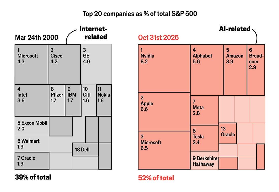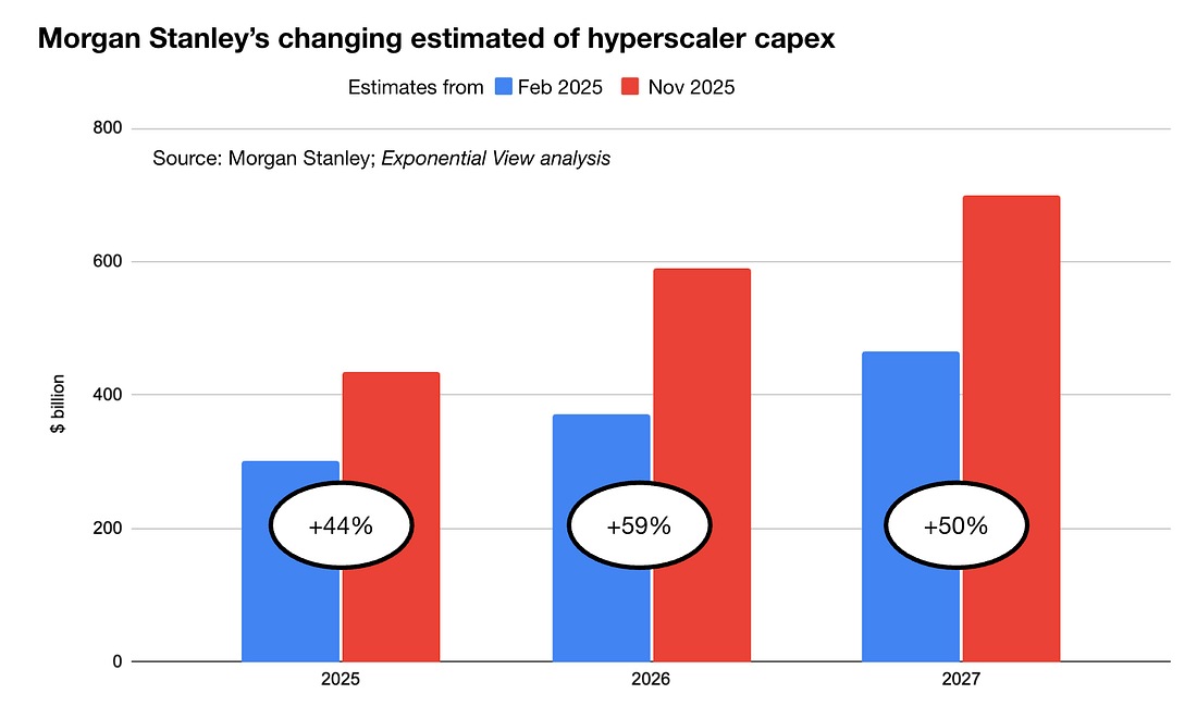 🔮 Exponential View #549: Volatile markets; infinite compute; Kimi K2’s frontier leap; orbital computing++A weekly briefing on AI and exponential technologiesGood morning from New York City! First, a couple of podcasts for your weekend. In my latest episode, I zoom out to explain why we’re not just in an “AI moment”, but at the start of an economy built on effectively infinite compute: You can also catch me in conversation with a16z’s Ryan K. Rigney discussing the AI bubble question: All-inBig Tech’s bond binge has topped $200 billion, the market is all-in. We have data center debt, private credit warehousing and AI-linked ETFs. OpenAI projects $100 billion in revenue by 2027—when we broke down the numbers, we were surprised to find out that this is not out of the question. The market remains on tenterhooks. When OpenAI’s Sarah Friar cackhandedly talked about government loan guarantees, it freaked the market out. Red was everywhere, and $800 billion knocked out tech stocks. It was the worst week since, wait for it, April 2025. It remains in line with typical volatility of growth stocks, or “move along” as Obi-Wan Kenobi instructed. Of course, how you read this depends on what you think AI is. If you believe that we are in the midst of a productivity boom, it’s a no-brainer. But if you think AI (specifically the LLM modality) is too unreliable to be useful, the risks simply shift to society and compound. The Financial Times’s Alphaville, generally sceptical commentators on AI, unwittingly points out that about a sixth of American firms are already seeing “material contribution to earnings from [AI] deployments.” It’s an absolutely remarkable achievement to reach this proportion within a couple of years into the cycle. If that 16% falls below 25% this time next year, AI is falling short of expectations. If it is much above 33%, it is more than proving its mettle.¹ Despite this, household equity exposure is at a record high and The Economist estimates that if AI tech valuations were to crack, there would be a 2.9% hit to GDP via consumption from wealth effects alone. The US economy leans heavily on AI. AI bubble watch – weekly update📈 Quick reading: A boom with some bubble flavoring. One of the five indicators is red, well within our boom range. What moved this week: