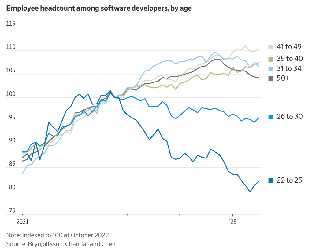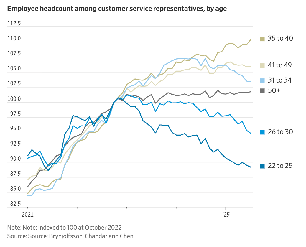 Weekly writing about how technology and people intersect. By day, I’m building Daybreak to partner with early-stage founders. By night, I’m writing Digital Native about market trends and startup opportunities. If you haven’t subscribed, join 70,000+ weekly readers by subscribing here: How to Productize AI AnxietyIt’s not surprising that there’s a lot of AI anxiety right now; we have a long history of doomsday sci-fi portrayals of AI. Way back in 1920, a Czech play called “R.U.R. (Rossum’s Universal Robots” introduced the word “robot” to society. The storyline? Artificial workers gain consciousness and revolt. Here’s an image from the play: I spent much of Labor Day weekend watching Battlestar Galactica, the 2003 cult classic TV series. (I’d never seen it—I know, I know.) The premise of the show: humans create Cylons, sentient robots designed to help our species. Naturally, the Cylons rebel and become set on exterminating humans. The show covers a brutal war that ensues between human and Cylon. The list goes on: Terminator (self-aware AI launches nuclear war and creates killing machines), 2001: A Space Odyssey (“I’m sorry Dave, I’m afraid I can’t do that” - Hal 9000), The Matrix (AI enslaves humanity), even the more recent M3GAN (murderous AI doll!). It’s no wonder people freak out when Sam Altman says AGI is imminent. One of my favorite recent cartoons: There’s a lot of anxiety when it comes to AI, period. But there’s especially a lot of anxiety when it comes to AI + work. Last week, a Stanford survey about AI and jobs made the rounds. Here’s Derek Thompson summarizing the findings: