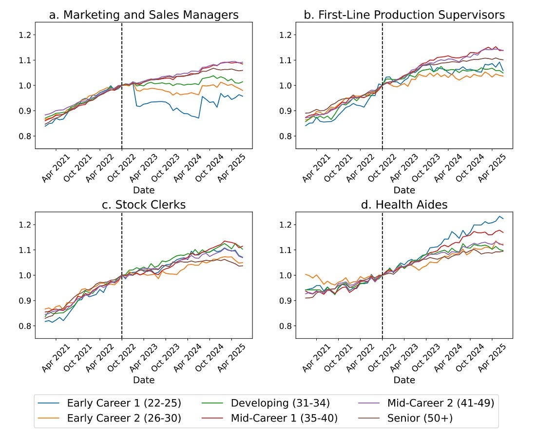 Here are a couple charts covering the two professions the paper singled out—software developers and customer service agents: Yikes. Young workers are clearly hurting the most here. This dovetails with what I hear anecdotally from companies: AI isn’t causing employers to fire workers (yet); rather, companies are simply reducing their hiring plans. If you were going to hire 30 engineers next year, maybe you can now make do with five. If you were going to hire 20 customer service reps, maybe three will do. And so on. Companies can do more with less. Existing workers, naturally, tend to skew older, which is why those cohorts look okay in the charts above. Meanwhile, new entrants to the job market (the young workers) are getting shafted. By the way, the Stanford report does a good job showing that this isn’t an economy-wide trend. For instance, you can see here how home health aides are unaffected, while “AI-exposed” jobs like marketing and sales managers are deeply impacted: Sure, people might fret about Battlestar Galactica-level wars with robots down the road. But right now, most people are just worried about AI taking their job. For applied AI companies, this means you have to navigate customers who are weary and wary of your product. This isn’t easy. I’ve been calling this “productizing AI anxiety.” How do you leverage AI anxiety and FOMO to your advantage? Let’s touch on two sides of the equation: (1) marketing / sales and (2) product. Marketing / SalesOn the marketing side, applied AI companies need to make their product synonymous with: