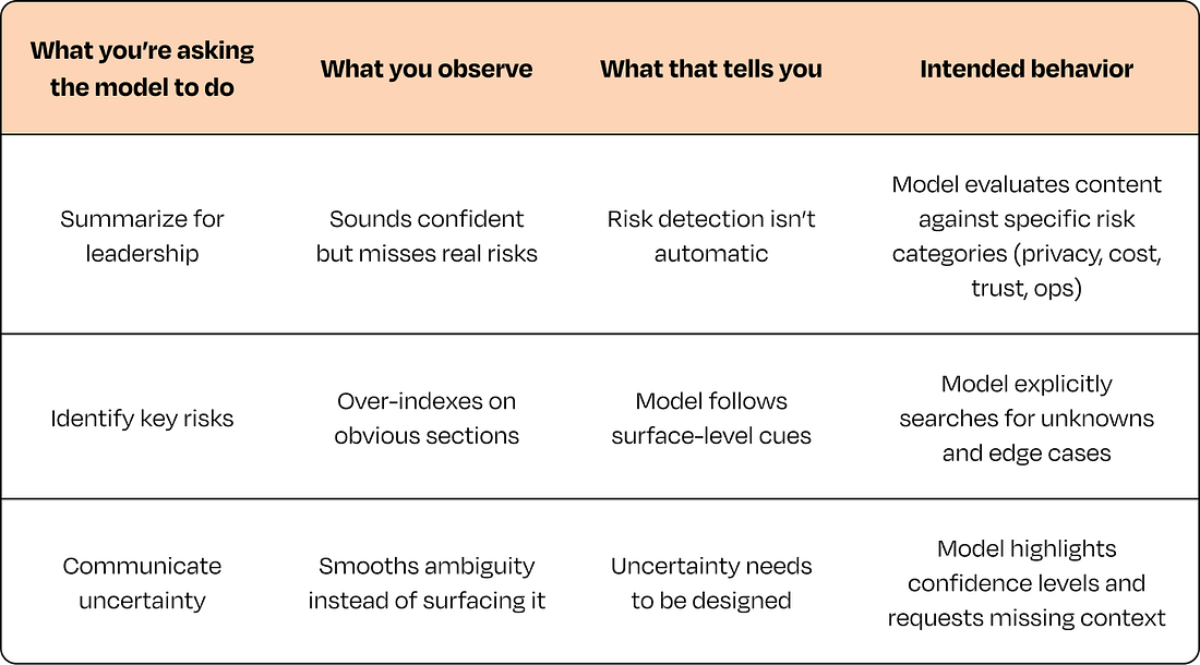 The model’s failures reveal where its semantic fragility is—in what ways the model technically understands your words but completely misses your intent. Other examples could be if you ask for a summary for leaders and it gives you a bullet list of emojis and jokes from the thread. Or you ask for UX problems and it confidently proposes a new pricing model. What you’re learning here is where the model gets confused, which is exactly where your product should step in and do the work to reduce ambiguity. That could mean asking the user to choose a goal (“Summarize for who?”), giving the model more context, or constraining the action so the model can’t go off-track. You’re not trying to “trick” the model; you’re trying to understand where communication breaks so you can prevent misunderstanding through design. Ambiguous prompts: what to test, what breaks, what to doHere are a few ambiguous prompts to try, along with the different interpretations you should explicitly test: Now you have another batch of design work for the AI product to help guide it toward predictable and trustworthy results. Ritual 3: Ask a model to do something unexpectedly difficult (3 min.)Goal: Understand the model’s first point of failure Pick one task that feels simple to a human PM but stresses a model’s reasoning, context, or judgment. You’re not trying to exhaustively test the model. You’re trying to see where it breaks first, so you know where the product needs organizing structure. Where it starts to go wrong is exactly where you need to design guardrails, narrow inputs, or split the task into smaller steps. Note: This isn’t the final solution yet; it’s the intended behavior. In the guardrails section later, I’ll show how to turn this into an explicit rule in the product (prompt + UX + fallback behavior). Example 1: “Group these 40 bugs into themes and propose a roadmap.”Example 2: “Summarize this PRD and flag risks for leadership.”With results from all three rituals, you now have a complete list of product design work that needs to happen to get the results you and users can use and trust. Over time, this kind of work also starts to surface second-order effects—moments where a small AI feature quietly reshapes workflows, defaults, or expectations. System-level insights come later, once the foundations are solid. The first goal is to understand behavior. Define a minimum viable quality (MVQ)Even when you understand a model’s failure modes and have designed around them, it’s nearly impossible to entirely predict how AI features will behave once they hit the real world, but performance almost always drops once they’re out of the controlled development environment. Since you don’t know how it will drop or by how much, one of the best ways to keep the bar high from the start is to define a minimum viable quality (MVQ) and check it against your product throughout development. A strong MVQ explicitly defines three thresholds: