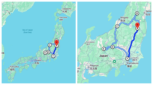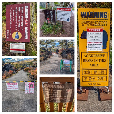 Our Road Trip in Japan: Searching for Autumn Colors in the Mountains of HonshuAfter a blistering-hot and very urban Asian summer, we were desperate for cooler temperatures and nature's wonder. Did we find it?Less than a month after we spent nine days touring Southern China, Brent and I just did a nine-day road trip through the mountains of central Japan. But this time, we went with two fellow nomads, Howard and Whitney Darby, a couple we connected with in Serbia three years ago. Better still, Howard organized most of the trip, renting the van, plotting the route, choosing our hotels, and selecting most of the sights along the way. He even did all the driving. Who would ever pass up a deal like that? The total cost, including car rental and insurance, gas, hotels, food, and admission to various attractions? About $1,913 USD per couple — or $212 per couple per day. Our trip started and ended in Tokyo. The route we chose kept us in the central part of Honshu, Japan’s main island, in hopes that Japan’s famous fall foliage would be on full display. Brent and I had just spent the summer in urban areas in South Korea, Taiwan, and Hong Kong, so while we were looking forward to the fall colors, we were also simply craving nature. And COOL TEMPERATURES. This year, the Asian summer heat has been unbearable. The trip involved a fair bit of driving — nearly 1,600 km/1,000 miles — but most days we kept it to no more than four hours on the road. Most of our accommodations were fair-to-good but unremarkable, with the notable exception of our first night, which was in one of Japan’s famous “love hotels.” We also splurged on three nights together in a nice Airbnb to give us a break from all the driving. We knew ahead of time that Japan’s blistering-hot summer had delayed the timing of the trees’ color change. This left us uncertain exactly how much color we would see. To paraphrase that old song from Pocahontas, did we end up painting with all the colors of the wind? Read on to find out! (Each day will be given a “Colors of the Wind” rating from 🍂🌿🌿🌿🌿 to 🍂🍂🍂🍂🍂 — one autumn leaf to five — to rank how spectacular the leaves were.) DAY ONE: Nikkō Tōshogū and the “Love Hotel.”On our first day, we saw Nikkō Tōshogū, one of Japan’s most famous and important shrines — even if I didn’t realize how famous it was until later, when I was writing this article. This is a Shinto shrine built in 1617, and unlike most Japanese shrines, which tend toward a minimalist design, this temple is filled with gold leaf, bright colors, and elaborate carvings. It’s widely considered to be one of the architectural peaks of the Edo Period, Japan’s feudal era. Nikkō Tōshogū was built to honor Tokugawa Ieyasu, the founder of the Tokugawa Shogunate. (A shogunate is a governmental system in ancient Japan run by and for the samurai; eventually, the shogun, or head of the shogunate, became more powerful than the emperor.) As spectacular as the temple was, the real highlight of the day may have been our lodging: Belfus Hotel in Koriyama — a “love hotel,” which is where many Japanese go for famously “discreet” sexual liaisons. But unlike in America, these often short-term hotels are not sleazy. We booked the Belfus through Booking.com, and Howard had a sneaking suspicion it was a love hotel — in part, because the price was so good. Then we arrived and saw the hourly rates and the highly discreet check-in process, and we knew for sure. There was also a wide variety of products available to “enhance” your visit — including, yes, a roll of plastic wrap in our room. Ironically, the room was possibly the cleanest we’ve ever stayed in. The thoroughness of their cleaning was a point they emphasized — for, er, obvious reasons. Naturally, we’ll be writing more on this in a future article. We did see a bit of color in the trees around the shrine, but the Colors of the Wind Rating for the day was still only: 🍂🍂🌿🌿🌿 [Two Autumn Leaves] DAY TWO: The bluest ponds you’ve ever seen, the valley in the sky, and bears, bears, bears!After a night of rest at the love hotel — no, seriously! — we set off for our next destination: Goshikinuma Ponds, located inside the Bandai-Asahi National Park. The ponds are popular with hikers who come to see their various shades of blue, ranging from cobalt to turquoise to lapis lazuli. The ponds, formed by the 1888 eruption of nearby Mount Bandai, get their color from minerals released by that eruption. While the ponds were very blue and helped scratch our itch for nature, the trees were mostly still all green, which was disappointing. Our next destination — the Nishi Azuma Sky Valley — seemed more promising. This 18-kilometer scenic drive through the Tohoku region of Japan is famous for its fall colors. But had we arrived too early? The colors were good, not great. And we saw very few Japanese maples, which are known for their vivid red color. But we did see several of Japan’s famous “snow monkeys,” often right along the road. The most memorable thing about our second day was something completely unexpected: signs everywhere about the danger posed by Japan’s black bears. Unbeknownst to us, Japan was suffering a record number of bear attacks, with six people having already been killed. By the time our trip was over, three more people would have died. Authorities believe that two main factors are causing the rise in bear attacks in Japan: