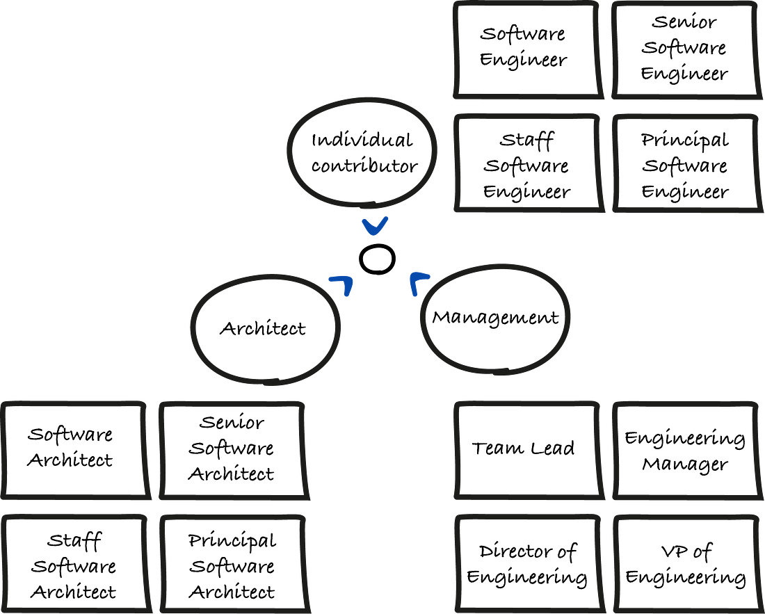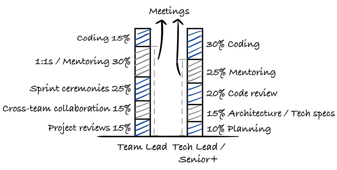 Team LeadThe difference between the Team Lead and a Tech Lead is that the Team Lead is normally the first role in the management path, which also includes people management and having direct reports, while as a Tech Lead, you don’t. Of course, this varies across different companies, and in some companies, a Team Lead doesn’t have direct reports and engineers report directly to the Engineering Manager. The main responsibilities of a Team Lead include facilitating meetings like daily meetings, retrospectives, sprint planning, etc., while at the same time also having 1:1 meetings with the team members, providing coaching and mentoring, giving feedback, and delegating work. I like to view this role as doing what’s best for the team. I like to say that as a Team Lead, you either do what the team needs or you hire to fill this gap. If the team lacks technical seniority, you need to fill this gap, and if the team is drowning in tasks, you focus on better prioritization, stakeholder management, or help with finishing the tasks. It’s certainly a role for good generalists. A similar role to the Team Lead is the Tech Lead Manager role, just the expectation is that you are doing both the role of a manager of the team and also being a Tech Lead at the same time. However, what works best in my opinion is to have these two roles separate, and as I mentioned before, I like to do a rotation of Tech Leads and not have just 1 fixed Tech Lead per team. Engineering ManagerThe Engineering Manager role is the step above the Team Lead role in the management path. In some companies, the EM role might mean the same thing as a Team Lead role, so that means that you lead 1 team, but for me, it means that you lead 3 or more teams, and Team Leads are reporting directly to you. This is the first time that you move yourself completely out of the day-to-day operations, and your main focus becomes delegation, coaching, overall structure, and the success of teams, while focusing on strategy and hiring. Some of the main responsibilities include roadmap planning together with other relevant people, setting KPIs (Key Performance Indicators), defining OKRs (Objectives and Key Results), being a good translator between business and tech, defining specific success metrics, tracking them, and focusing on improving, and of course, making sure that you hire the right people for your teams. You normally have 1:1 meetings with your direct reports (Team Leads), with your manager, alignment meetings with the leadership team and peers, and I also like to do 1 alignment meeting together with all the Team Leads once a week to ensure that we are all moving in the right direction. An interesting role that I wish to mention here is the Technical Program Manager (TPM). It’s a role that is not connected to the engineering track, but instead lives in the product track, so it shouldn’t be mixed with the Engineering Manager role. The difference is that the TPM has no direct reports and is overseeing and coordinating multiple projects or products, but the EM role is leading teams, where Team Leads and other Engineers are reporting to them (directly or indirectly). ArchitectLike the Tech Lead, the Architect role usually has no direct reports and relies on influence rather than authority. Team Leads and Engineering Managers, on the other hand, have direct reports. I normally introduce this role when the tech leads of the team can’t align on the architecture, and where inconsistencies of the implementations tend to happen across different teams. That’s when I look to add a person focusing on ensuring that the teams are aligned and that we are all architecturally moving in the right direction. The main focus is understanding what the most important things are for the business and translating that into good, long-term technical decisions. As an Architect, you work across different teams and work with them to ensure that they have everything they need to be successful. You design systems organization-wide, define technology standards and patterns to ensure scalability, security, and ease of integration. What I like to say about this role is that you need to think in years and not in sprints. Making good long-term decisions is where your main focus should be. There are many different variants of architects, and I’ve seen many titles across different companies. Here are the 4 that I believe are the most common (additionally to Software Architect):
