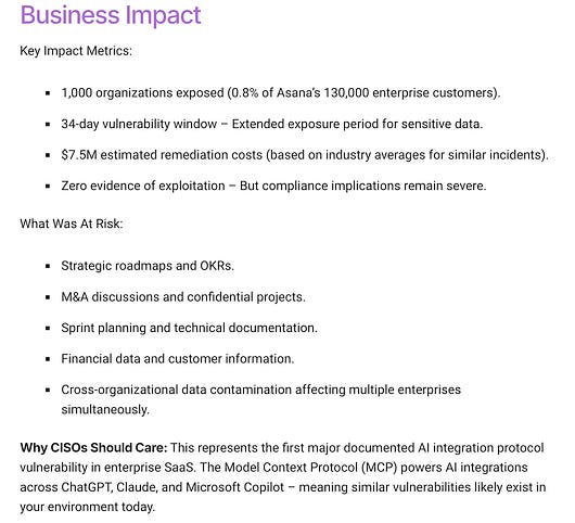 The latter of course has been a much harder conversation for many security practitioners, as they’re rightfully concerned with the security implications of AI adoption. That said, many should equally be concerned with the prospects of what AI can do for security, a point I tried to make in my own article titled “Security’s AI-Driven Dilemma: A discussion on the rise of AI-driven development and security’s challenge and opportunity to cross the chasm”. In that article I argued that security is historically a late adopter and laggard of technological waves, but AI offers an opportunity for cyber to be an early adopter and innovator, and to use the technology to address longstanding cyber issues. VC firm Chemistry makes a similar point in an recent article discussing how security needs to get over its trust issues and lean into adopting AI to aid security use cases. They point out examples from VulnMgt, AppSec, Email Security and more, along with vendors operating in those spaces (albeit likely with some bias for their portfolio companies). This piece lays out the various areas where AI is and will have an impact, tackling challenges around vulnerability backlogs, GRC artifacts and processes, SecOps alert fatigue, identity security and more. I agree with the authors and I’m excited about the prospect of AI in cyber. Secure AI Lifecycle (SAIL) FrameworkWith the rapid adoption and evolution of AI teams are often looking. for a framework to help turn principles and guidance into action. Asana AI Incident: Comprehensive Lessons Learned for Enterprise Security and CISOsWe recently saw incident involving Asana AI, which helps enable organizations with AI assistants. The incident impacted over 1,000 organizations data through a single line of code. This equates to 0.8% of Asana’s 130,000 enterprise customers. This piece from Adversa AI breaks the incident down, which is tied to MCP, which we’ve seen rapid adoption and implementation of, despite many security practitioners and researchers also raising security concerns. The blog does a great job summarizing key impact metrics, what was at risk and why this matters to CISO’s below: As the blog points out, the crux of the issue is that via the Asana MCP server, Organization A was able to query cached results from Organization B via a “confused deputy bug” in the MCP server, that doesn’t re-verify tenant context for cached responses, as well as a missing identity management piece for AI agents (a hot topic I have been talking quite a bit about). The blog dives much deeper in terms of who was involved, the specifics of the incident, and the technical details. It is worth a read. Intro to OAuth for MCP Servers with Aaron PareckiThere’s been a lot of fuzz about Authentication/Authorization when it comes to MCP among its rapid adoption. One of the key folks leading that thought leadership is Aaron Parecki at Okta, who has authored several crucial blogs on the topic as well as leading improvements for the MCP spec itself. I stumbled across this session Aaron delivered at the MCP Developers Summit, and I recommend giving it a listen if you’re looking to better understand MCP and OAuths intersection. AI Supply Chain ConstraintsWhile not a specific security topic, supply chain constraints can impact things such as availability and internal business AI initiatives. This piece from Venture Beat discusses an uncomfortable open dialogue that is happening more and more. This includes situations where leaders such as Anthropic, Cursor and OpenAI are seeing significant ARR growth but users are being constraints via API limitations and token shortages due to limits in power supply capacity, building permits, data centers, and high-end chip manufacturing. It dubbed it as “the capacity crisis no one talks about” and provides direct quotes from industry leaders about the token constraints they’re facing from leading providers as well as varying quality among the model providers. It is partially being driven by model providers using techniques to improve inference costs, only to suffer downstream quality impacts on model outputs.