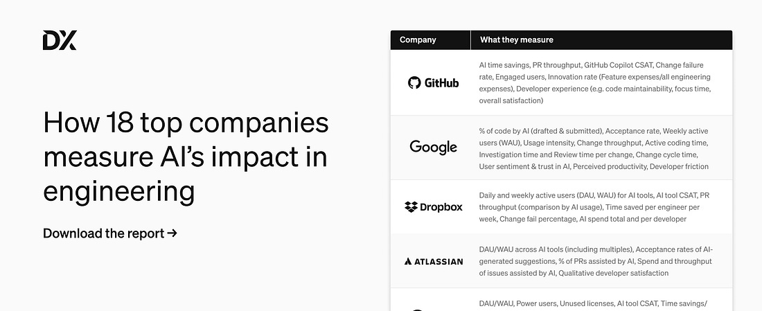 This week’s newsletter is sponsored by DX. How 18 Top Companies Measure AI’s Impact on Engineering Written by Laura Tacho, CTO at DX, this new industry report explores how 18 engineering organizations—including Dropbox, Microsoft, GitHub, Atlassian, Adyen, Booking.com, and Grammarly—are measuring AI’s impact on software development. Inside this report, you’ll learn: