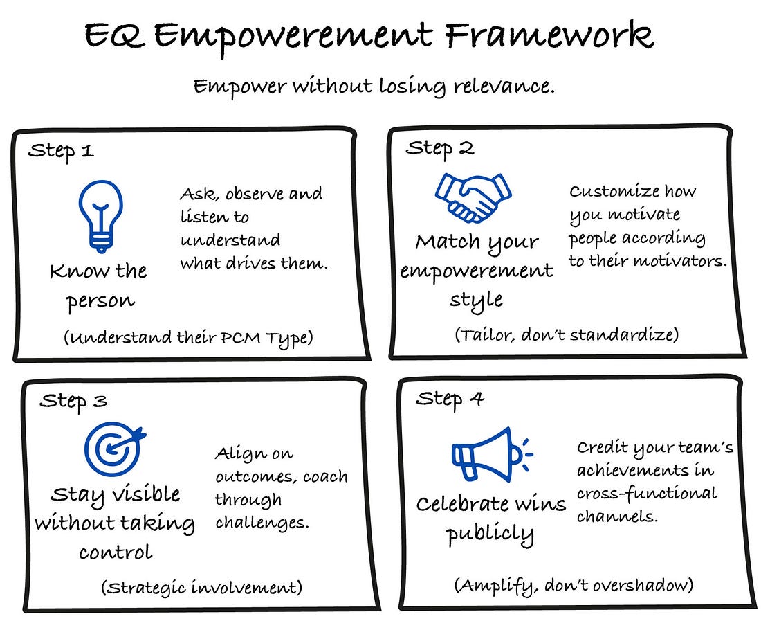 PCM gives you the roadmap for tailoring your leadership approach based on how people are wired. When you combine this with emotional intelligence, you unlock a much higher level of influence: you don’t just give autonomy, you give it in the way that motivates them most. This is the foundation for our EQ Empowerment Framework → a practical, four-step process to empower people effectively without losing your own relevance as a leader. The EQ Empowerment FrameworkEmpowering your team isn’t just about delegating tasks. It’s about building trust, matching autonomy to individual motivators, and staying strategically visible as a leader. This four-step framework connects emotional intelligence with the Process Communication Model (PCM) → giving you a practical way to empower different personality types while maintaining your influence. Step 1: Know the Person (Understand their PCM type)Before you can empower effectively, you need to understand what drives each person: