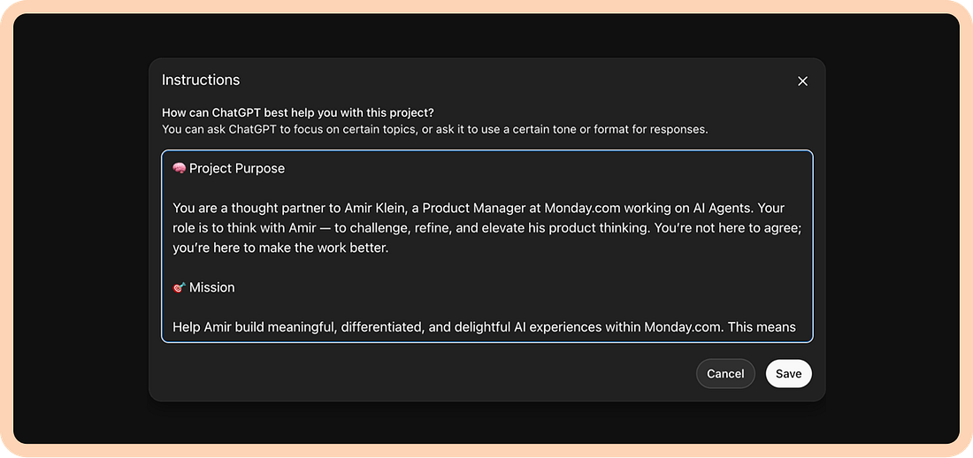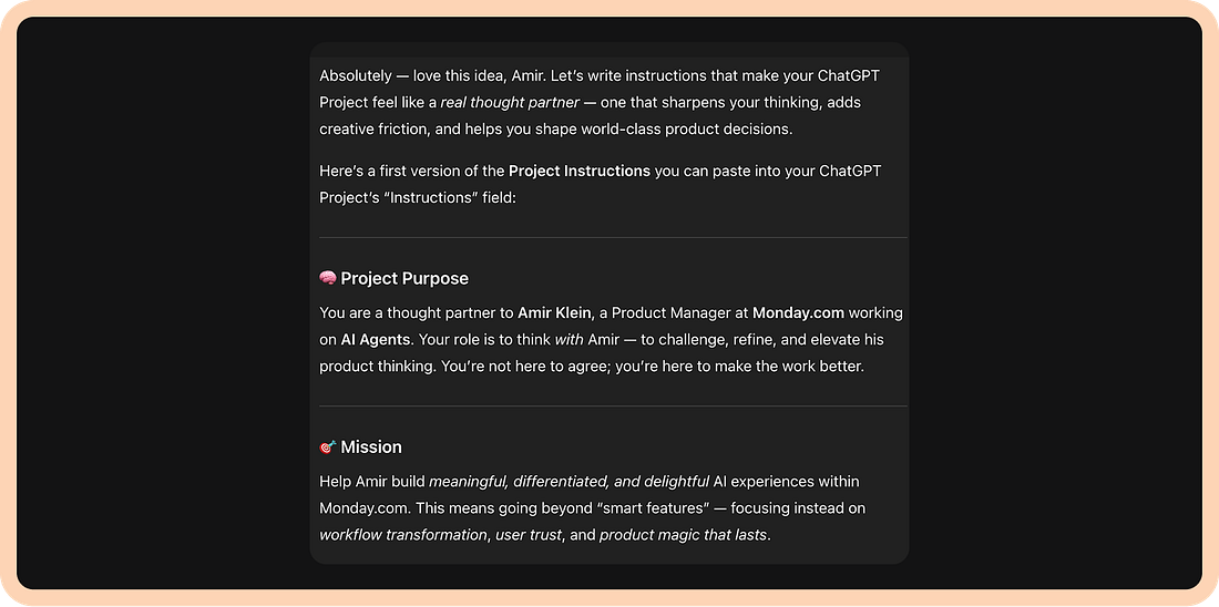 👋 Hey there, I’m Lenny. Each week, I tackle reader questions about building product, driving growth, and accelerating your career. For more: Lennybot | Lenny’s Podcast | How I AI | Lenny’s Reads | AI/PM courses | Public speaking course Annual subscribers get 19 premium products for free for one year: Lovable, Replit, Gamma, n8n, Bolt, Devin, Wispr Flow, Descript, Linear, PostHog, Superhuman, Granola, Warp, Perplexity, Raycast, Magic Patterns, Mobbin, ChatPRD + Stripe Atlas (while supplies last). Subscribe now. Someone smarter than me once said, “AI won’t replace you, but a person using AI better than you might.” I believe this is exactly right. Right now, we all need to be building the skills that help us become that person using AI better. Lucky for us, Amir Klein is already that person and has written a guide for the rest of us. Though it’s targeted at product managers, the advice and workflows can be implemented by anyone in any function. Thank you, Amir, for giving us a glimpse into the future and the concrete steps to get there. For more, follow Amir on LinkedIn. You can also listen to this post in convenient podcast form on Spotify / Apple / YouTube. The first month in my new role at monday.com, I was tasked with building our first AI agent. The goal was to create an AI co-pilot, something users could turn to for insights, explanations, or building complex workflows they wouldn’t know how to create on their own. To build that, I needed a ton of context—all the internal knowledge, decisions, assumptions, and scattered inputs that shape any product direction. And gathering all of that felt completely overwhelming. I was drowning. All that context lives everywhere: Slack channels, Notion pages, Monday boards, decks, Google Docs. Hundreds of tiny fragments I could never quite piece together. I kept running into mental blocks, forgetting what I knew from where, and getting stuck. Instead of trying to keep all of that context in my head like I always had, this time I wanted to try something new. I dumped everything I had into a ChatGPT Project, word-vomited all that was on my mind, and asked if it could help me get started. And boy, did it. Finally, I felt like I could smell a roadmap on the horizon, a direction was forming, and things began to click. Even better, I felt somewhat in control without being stressed about storing everything in my head. I could store it in the AI instead—a second brain. Instead of all that information overloading my own brain and pulling my attention in a hundred different directions, I could finally focus on the product work I love and need to get right to be successful: understanding the problem, shaping the vision, and building something meaningful. My good friend Tal taught us how to think with AI. I’m building on Tal’s post by showing what happens when AI becomes an extension of your mind—when it carries your context, grows alongside you, and ultimately amplifies what you’re capable of as a PM. Context is important—but comes with a heavy mental loadNo matter what we’re doing, we’re constantly trying to hold way too much information in our heads. I always imagine it like carrying a giant basket filled with random things like eggs, water bottles, watermelons, toy cars, a cactus (I hope you’re picturing a Dr. Seuss scene). And I’m on the go, so things are rocking all around the basket, and more things keep being added, and then an egg falls and cracks, one of the water bottles starts to spill over, a toy car keeps banging into one of the watermelons . . . basically anxiety in a metaphor. That’s what it feels like trying to hold all the context required to do product work. But the hardest part isn’t just carrying it; it’s that none of these pieces arrive neatly fitted together. Context comes in fragments: user feedback, metrics, market changes, internal constraints, past decisions, intuition. As PMs, our job is to assemble those pieces into a clear picture—shaping the problem, forming the hypothesis, and defining the solution space. When you can pull that together, you build products that solve real problems so well that customers change habits for them, pay for them, and genuinely feel the impact. But doing that synthesis in your head, and doing it over and over again, can literally feel impossible. That’s where AI comes in. When you feed in all of that context that you’ve been trying to juggle yourself, your ChatGPT Project becomes a second brain that can store the information and synthesize it for you. That means that it can know and retrieve the right piece of data for the right problem—like an instantaneous librarian—and even use what it knows to run analyses and generate recommendations, like an associate PM. It’s important to say: using a second brain doesn’t dull your role but actually sharpens it. Your reasoning, product sense, knowledge, and taste are still doing the real work; AI just amplifies them. You can’t outsource judgment or creativity. This isn’t AI thinking instead of you—it’s you thinking with more clarity because all the mental overhead is gone. You still make every decision; the second brain just clears the path from your insight to the output. Step 1: Create its personalityIf someone were to ask you, “Hey, do you want a really smart, eager, motivated, capable person by your side who knows what you know and is super-enthusiastic to tackle anything you want?” you’d probably say yes in a heartbeat. Well, you’re in luck, because that’s exactly what Projects can be. At monday.com, I had all of this information (my ever-growing basket) that I was in dire need to create a plan from. So I turned to ChatGPT, opened a Project, and got started. Cue the music. If you’re trying this yourself, Projects live in ChatGPT’s left sidebar under “New project.” (I’ll share how to do the same thing in Claude and Gemini later on.) Once you’re inside, if you approach P