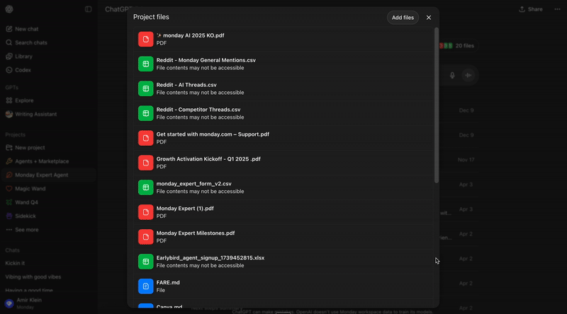 It’ll output instructions for what you want: Tweak what you want or just copy the whole thing as is into the instructions page, and your second brain is now eagerly waiting for you to feed it information! Step 2: Feed it informationNow comes the fun and legitimately relieving part: feeding it all that context that you are barely holding onto. Go to “Add files” and just dump it in. I think the biggest “whoa” moment for me is realizing that everything is essentially text. The classics, like PRDs and docs, are a given, but decks, websites, Excel/CSV sheets, dashboards, and Slack channels all contain text too. They just need to be exported into PDFs and then you can upload them into the files section too. Once you see everything as text, you start to understand how much context you can actually give your second brain. Here’s what that looks like in practice: I’ll scroll through a massive Slack channel that’s gotten impossible to navigate. I’ll export it or, if that’s not possible, I’ll copy and paste the entire channel’s contents into a doc and save it as a PDF. Then I drop it into the Project. Now ChatGPT knows what has already been discussed, what decisions were made, and what issues keep resurfacing. When I need it to understand our product’s capabilities, instead of rambling on to it about how my product works, I go to our support or docs site, hit Command + P, and save the entire page as a PDF to drop in. That way, whenever I mention a feature, my second brain already knows how it works. I do the same with research data like transcripts, interviews, surveys, CSVs. Everything becomes fuel. Each file adds depth to the brain. In the case of the first initiative I led at monday.com, I started with a few decks that different colleagues of mine had made, downloaded PDFs of monday.com documentation pages explaining how specific things work, and added a bunch of CSV files containing Reddit threads of conversations thousands of people had about monday.com in relation to AI and our competitors. This was enough to get the ball rolling and start formulating a plan. The beauty of Projects is that you’ll start creating new artifacts from it. Whatever it is you’re creating—whether it be PRDs, overview docs, or strategy decks—once finished, you can take those, put them in a doc, download them, and feed them back into your second brain. Each new thread you open will be up to date with you on your work. It becomes a living thing. This is what my Project ended up containing after hundreds of threads: Step 3: Let it cookThere’s no one specific thing to use Projects for. As your second brain becomes more and more knowledgeable about your work, you can lean on it for everything that you don’t want to do but needs to get done. For example: 1. Sign-up forms I needed to create a sign-up form for users to get early access to the agent we were building. This is a classic case of something that seems pretty easy at first but ends up making you bang your head against a wall. How should I phrase what I want to ask? How do I make the output from the form clear and purposeful for me without making filling out the form exhausting for users? Your second brain can now swoop in to save the day as it holds all the context on your initiative. In this case, I asked:
