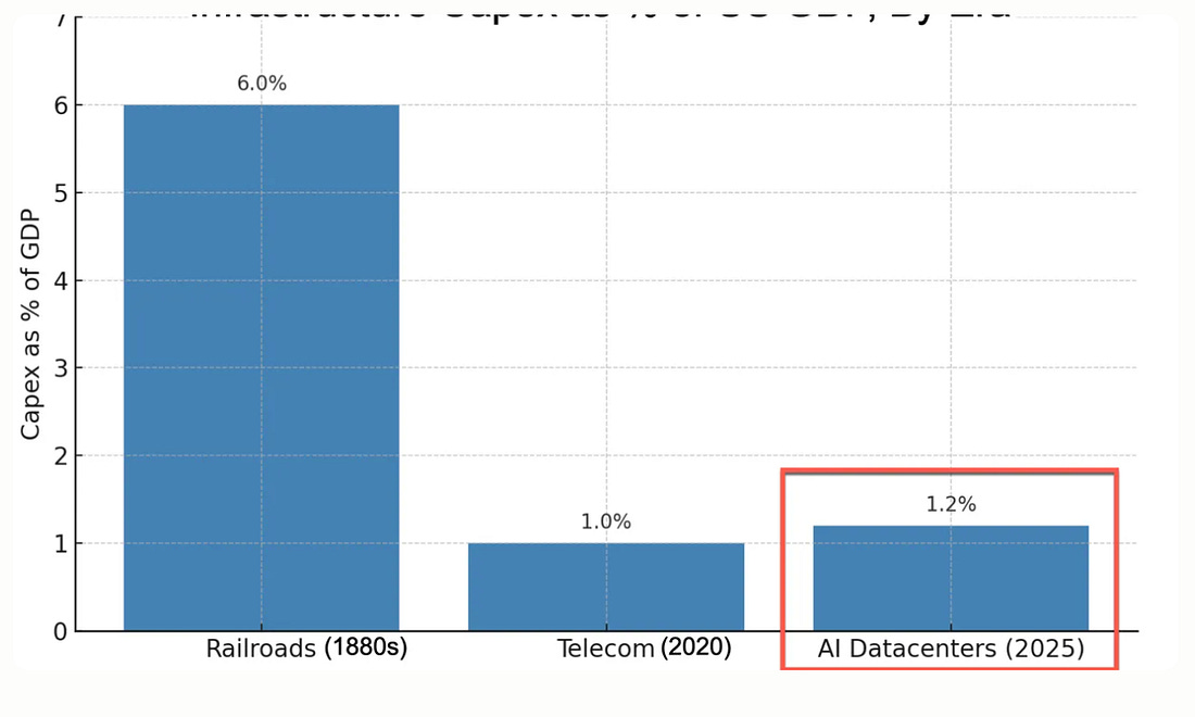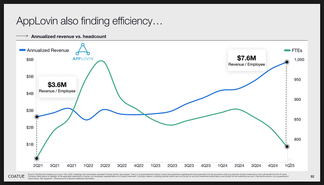There are plenty of other reasons, but these are a few: durable revenue, reliable buyers and sellers, long-term earned credibility. There’s probably a lesson here for the AI bubble we’re in the midst of. Companies should be asking themselves: am I offering a Labubu or a Pikachu? 5️⃣ The App Economy Moves Beyond GamesThis moment has been a long time coming: non-gaming app revenue finally surpassed gaming app revenue: Consumer app subscription has been a great category for years, powering big companies like Spotify, Tinder, and Duolingo. You can clearly build a $10B+ (even $100B+ in Spotify’s case) consumer internet business on subscription revenue. We have a couple consumer subscription companies in the Daybreak portfolio, including one of our early value-drivers. Consumers are clearly willing to pay for stuff—ads aren’t the only business model in town—and shifts like ATT (making ads less attractive for companies) and Apple Pay (removing friction for paywalls) help push this forward. It’s hard to mention the chart above and not mention AppLovin, one of the best-performing stocks of the year ($212B market cap, up almost 4x in the last year). Our last version of “10 Charts” mentioned AppLovin’s revenue per headcount, which has doubled in recent years: AppLovin is powering much of the surging non-gaming revenue shown in the chart above, as the company focuses on diversifying away from gaming. For example, AppLovin has strategically expanded into e-commerce, fintech, and business apps. In Q1, AppLovin ad revenue grew +71% year-over-year, largely on the back on non-gaming revenue. The company sold its “Apps” business (mostly mobile games) to Tripledot Studios and now seems focused on its high-margin advertising software platform. And for good reason—from an equity research report: “Given the ~90% incremental margins for APP’s ad business, we would expect a relatively clean translation to earnings where every $100mn of non-gaming ad spend would drive $90mn (or ~1.5%) upside/downside to ‘26 EBITDA.” Not a bad business model. 6️⃣ AI Revenue Overtakes SaaS RevenueAnother example of one type of revenue overtaking another: Revenue from AI Labs + public AI infrastructure companies has eclipsed all of public SaaS revenue in 2024. And on a net new revenue basis, it’s nearly 2x. The center of gravity in tech is clearly moving from software to compute. SaaS no longer defines public market tech. Rather, NVIDIA’s datacenter business (and the hyperscalers it powers) are the new backbone of tech. The other way to read this chart, in my mind, is that AI’s value still sits in its “supply chain” (the infrastructure suppliers like NVIDIA, cloud providers, labs) and hasn’t moved downstream to traditional software. Public SaaS companies aren’t yet reaping the benefits of AI, and we’ll see when (or if) that changes. 7️⃣ Will AI CapEx Catch Railroads?To continue with AI spend, Big Tech is spending a lot on AI infrastructure: The way to read this chart is: in the last three months alone, four companies spent almost $100 billion (with a b) on data centers and the like. Here’s how this compares to past eras of innovation: