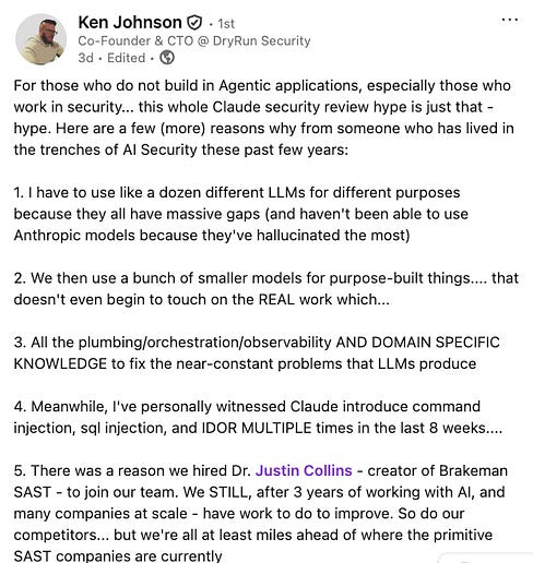 Claude Code Security: A Reasoned Take on What It Means for AppSecLLMs are changing vulnerability discovery, but the complexity of application security demands more than reasoning aloneThis week the AppSec world is still buzzing from Anthropic’s launch of Claude Code Security, a native capability built into Claude Code that scans codebases for vulnerabilities and suggests targeted patches using reasoning-based analysis rather than traditional rule matching. Within hours of the announcement, cybersecurity stocks tumbled. CrowdStrike dropped nearly 8%, Okta fell almost 10%, and JFrog shed roughly 25%. The Global X Cybersecurity ETF extended its year-to-date losses to nearly 16%. As I wrote in my initial reaction, the market is pricing in the directional signal: frontier AI labs are moving from only writing code to also policing it. But markets often trade the direction of travel, not the fine print, and the fine print here matters enormously. Claude Code Security is a meaningful step forward. It is not, however, a panacea. And the gap between a compelling research preview and a production-grade AppSec program is wider than most of the excited commentary acknowledges. Interested in sponsoring an issue of Resilient Cyber? This includes reaching over 31,000 subscribers, ranging from Developers, Engineers, Architects, CISO’s/Security Leaders and Business Executives Reach out below! What Claude Code Security Actually DoesRather than scanning for known patterns the way legacy SAST tools do, Claude Code Security reads and reasons about code contextually, understanding how components interact, tracing data flows, and catching complex vulnerabilities that rule-based approaches miss. Every finding goes through a multi-stage verification process where Claude re-examines each result, attempting to prove or disprove its own conclusions before surfacing them to analysts. Findings are assigned severity and confidence ratings, and nothing gets applied without human approval. The results backing this up are genuinely impressive. Using Claude Opus 4.6, Anthropic’s team found over 500 previously unknown high-severity vulnerabilities in production open-source codebases, bugs that had gone undetected for decades despite years of expert review and fuzzing. These included subtle heap buffer overflows and complex logic flaws that traditional scanners consistently miss. This matters because the vulnerability classes that actually get exploited in the wild are overwhelmingly the ones traditional SAST tools struggle with. Look at OWASP’s 2025 Top 10 update: Broken Access Control has been sitting at the top of the list for half a decade. That’s a business logic and authorization problem, not a pattern-matching problem. If LLM-based reasoning can make a real dent in those categories, it’s a significant advancement for defenders. This is a topic I discussed in my prior article “The OWASP Top 10 Gets Modernized”. Where LLMs Genuinely HelpI want to give credit where it’s due, as the research supporting LLM-augmented code analysis is substantial and growing. Multiple studies have demonstrated that coupling LLMs with traditional SAST tools can dramatically improve signal quality. Research on LLM-Driven SAST approaches has shown false positive reductions in the 91–98% range. Other work, including the IRIS neuro-symbolic approach from ICLR and Datadog’s Bits AI integration, confirms that the hybrid pattern of using SAST for initial detection and LLMs for contextual validation is the most promising direction. This is genuinely transformative for an industry where false positive rates have been the primary driver of developer distrust and tool abandonment. Anyone who has worked in AppSec knows the painful reality: teams drowning in findings, developers ignoring scanners because 60–80% of what gets flagged isn’t exploitable, and security backlogs growing faster than they can be triaged. These are topics I have addressed many times, in articles such as “Security Throwing Toil Over the Fence”. If LLMs can be the intelligent triage layer that converts a mountain of alerts into a handful of verified, actionable findings, that alone changes the economics of AppSec. It can also help us get away from developers considering security a “soul withering chore”. The leading research consensus is clear: the winning approach isn’t LLMs alone or SAST alone, it’s coupling them together so that each compensates for the other’s weaknesses. The Problems That RemainBut here’s where the nuance matters, and where much of the hype-driven commentary misses the mark. LLMs are probabilistic systems. They hallucinate. They’re inconsistent across runs. They consume significant tokens and compute. And when it comes to generating secure code, the data is sobering. Some of these points were made by DryRun Security’s Cofounder & CTO, Ken Johnson: BaxBench, the ETH Zurich benchmark evaluating LLMs on backend code generation, found that 62% of solutions generated by even the best models are either functionally incorrect or contain security vulnerabilities. Of the code that works correctly, roughly half can still be exploited. I covered BaxBench and similar findings in my article “Fast and Flawed,” where I dug into Veracode’s research showing that nearly half of all LLM outputs were insecure, and that security performance remained flat despite larger and newer models. Bigger doesn’t mean more secure. Similar research such as “SusVibes”, found significantly higher functional pass rates than security pass rates in their research: Now for those saying, yes but that research was on earlier models, SonarSource’s analysis of Opus 4.6 itself, published the same day as the Claude Code Security announcement, showed that vulnerability density in code generated by Opus 4.6 has actually increased by 55% compared to its predecessor. Path traversal risks rose 278%. Code smells increased 21%, accompanied by a 50% spike