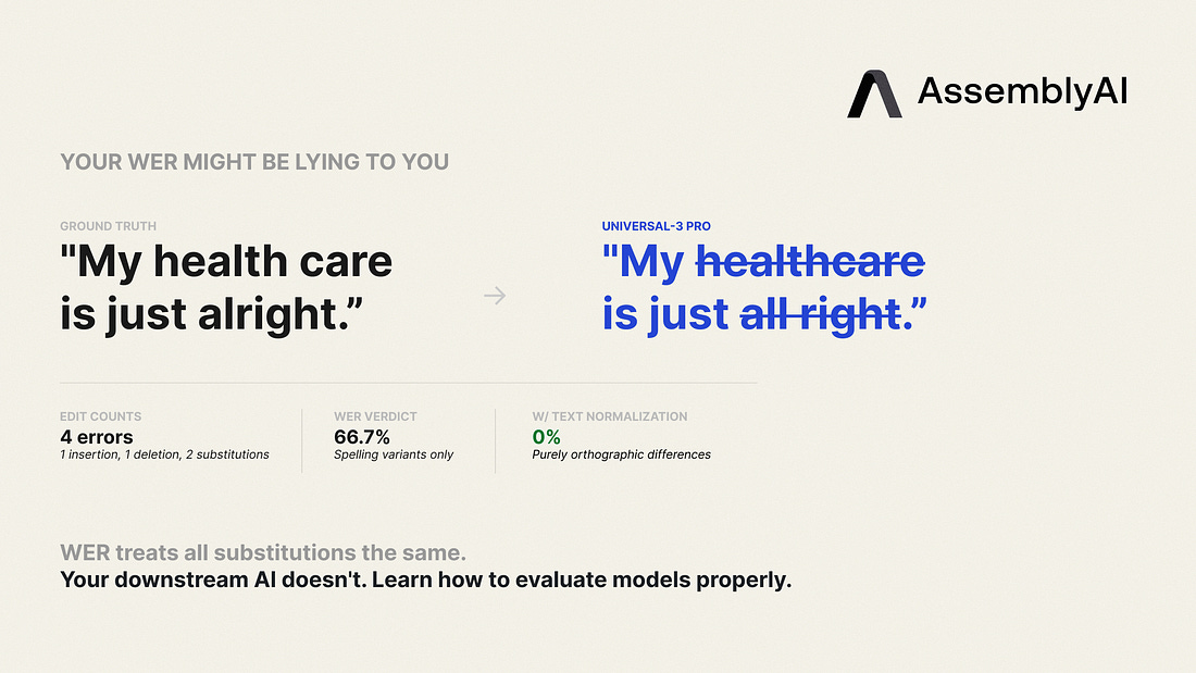New model, worse benchmark. Plot twist: the truth files were wrong. AssemblyAI found their AI penalized for transcribing things correctly that human labelers missed. Live workshop March 31 on why WER breaks and how to fix your eval pipeline.*