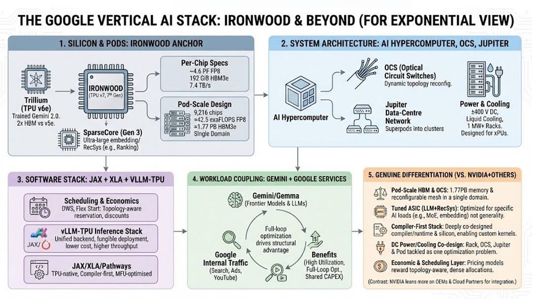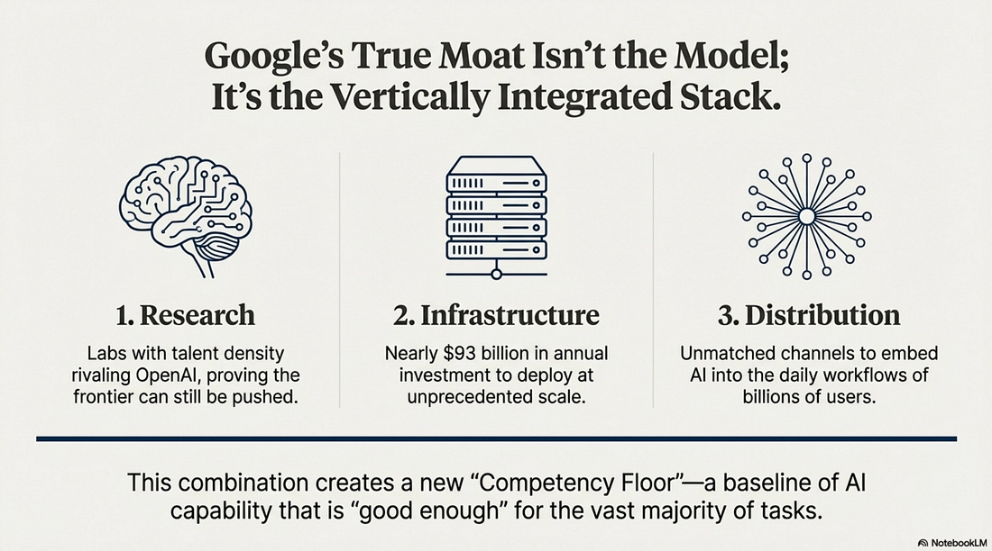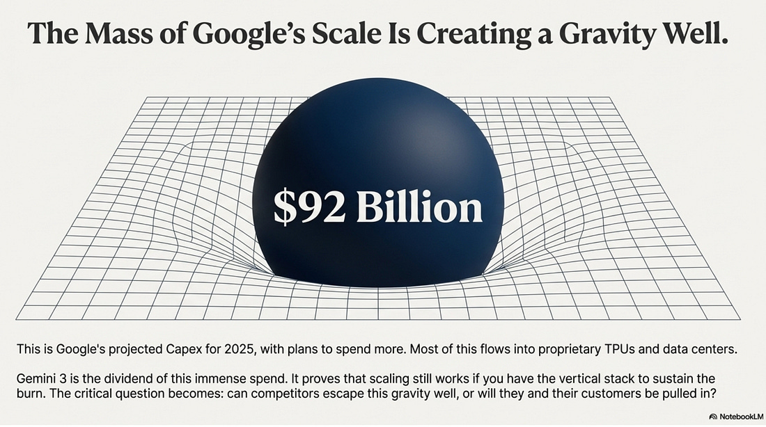 Early Black Friday, but smarter. An exclusive Exponential View offer for rigorous, hype-free AI insight. Limited seats, ends Monday, 24 November. Some two and a half years ago, Google faced a GPT tidal wave. Sundar Pichai may (or may not) have declared a “code red.” This week, words gave way to a physics lesson in vertical integration. When massive objects warp spacetime, smaller things will either get captured by the gravity well or achieve escape velocity. Google is adding enormous mass to the AI field: $93 billion in capex, custom silicon, vertical integration top to bottom, coupled with the breakthroughs from the research team at Google DeepMind. Does that mean game over for competitors? Well only if intelligence is a monolithic mass, one dimension where the biggest model always wins. But that “God Model” fallacy, the notion that intelligence is monolithic, doesn’t sit with my intuitions, as I have written previously. Recent research from Epoch AI concurs, suggesting intelligence is more multifaceted. If that’s true, Google’s gravity well has a floor but not a ceiling. It’s tough to escape by matching their mass. You escape by achieving different densities in other dimensions. Keep that frame in mind as we look at what Google just shipped this week. Inside the launchThis week Google released a new flagship LLM, Gemini 3, which includes an advanced thinking capability called DeepThink. Accompanying the launch was a remarkable new image generator called Nano Banana 3 and some developer tools. I’ve been running Gemini 3 through my usual battery of tests in the run-up to this week’s launch. It’s a noticeable upgrade on Gemini 2.5 – sharper reasoning and a real jump in dealing with complex, theoretical questions. It’s also a concise communicator. Compared to GPT-5, differences showed up quickly. GPT-5 tends to pile on layers of complexity; Gemini 3 gets to the point. That clarity compounds over hundreds of queries. I now default about a third of my prompts to Gemini 3. I’ve also moved a high‑stakes multi‑agent “council of elders” workflow, where several different prompts challenge and critique analyses, from GPT‑5 to Gemini 3. In that workflow GPT-5 worked noticeably better than Claude 4.5; Gemini 3 Pro is the best of the lot. Model choice isn’t about novelty-chasing. You’re recalibrating the tone of a colleague you consult dozens of times each day. And for those who need numbers, Gemini 3 Pro tops Anthropic and OpenAI across a wide range of benchmarks. If we just focused on Alphabet’s technical milestones, we’d miss half the picture. The unsung hero here is the firm’s deep infrastructure. Markets are jittery about AI spend and the bubble chatter. It’s the tension of the “exponential gap”, linear financing pulled by exponential tech. Even Sundar Pichai has flagged elements of “irrationality.” Alphabet raised its capex guidance three times this year. It now expects $91-93 billion of capital expenditure in 2025, up from about $52.5 billion in 2024, and has already signalled a “significant increase” again in 2026. So far, that splurge has not forced a retreat from the financial cosseting that Alphabet offers its investors. The firm authorised a $70 billion buyback in 2025, spent roughly $62 billion on repurchases and $7 billion on dividends in 2024, and is still retiring around $10-12 billion of stock a quarter while paying a $0.21 quarterly dividend. The vast bulk of the capex is going into technical infrastructure, servers, custom tensor processing units and the data centres and networks that house them, with recent cycles funding the shift to the new Ironwood TPUs and the AI Hypercomputer fabric that ties them together. Nvidia will still get a slice. Google Cloud continues to roll out high‑end Hopper‑ and Blackwell‑class GPU instances, and the Gemini and Gemma families are being optimised to run on Nvidia hardware for customers who want them. But the core Gemini stack – training and Google’s own first‑party serving – now runs almost entirely on its in‑house TPUs. And those Ironwoods are impressive. They are comparable to Nvidia’s Blackwell B200 chips, delivering similar amounts of raw processing (42 exaFLOPs FP8 for Ironwood) and the same 192GB of HBM3e memory. But Google’s chips only need to be good at one thing: “Google-style” house models, massive LLMs with Mixture-of-Experts inference, for high-throughput serving. And so Ironwood promises lower cost per token and latency for Google services. Gemini 3 is the dividend of that spending. Crucially, the new model also addressed a criticism thrown at this sector. For the past few years, foundation model labs have bet on scaling laws, which state that spending more on data and compute reliably produces performance improvements. Many outside commentators claimed that scaling itself had failed. My view, last year, was that while other innovations would be welcome, scaling still had some years to go. In the words of Google researcher, Oriol Vinyals, on the subject of pre-training scaling: