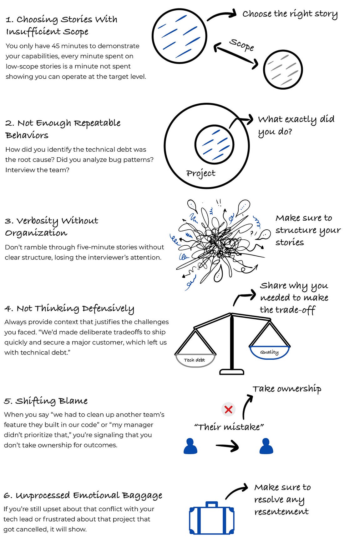 2. Relevance The story should naturally demonstrate the signal areas requested. But scope matters more than exact matching. If you’re asked about a conflict with your manager but your biggest conflict was actually with a product partner, tell the product partner story. You still demonstrate conflict resolution with someone in a position of influence, but you showcase more of your repeatable behaviors. Time is short in interviews, so use your time to get out the largest scope stories. 3. Uniqueness If you’ve already told a story in the interview, try to cover new ground with your next one. But don’t sacrifice scope or relevance for variety. 4. Recency More recent stories carry more weight because they represent your current capabilities. But for senior candidates, a standout story from two years ago often beats a mediocre story from last month. For more on story selection, including how to handle edge cases and different question types, check out the Select chapter in Mastering Behavioral Interviews. Common Pitfalls That Cost Senior Engineers OffersAfter coaching over 200 engineers through behavioral prep, many of them senior, staff, or principal level, I see the same mistakes repeatedly: 1. Choosing Stories with Insufficient ScopeYou’re nervous in the interview. The interviewer asks “Tell me about a time you had a conflict with a manager.” You have an example that matches exactly, so you tell it. But it’s a small-scope conflict about whether to spend a day refactoring some code. Meanwhile, you also resolved a major disagreement with a cross-team tech lead about resource planning for your teams. That’s the story you should tell. The interviewer is less interested in manager conflicts than they want to see how you handle high-stakes disagreements with leadership. When you only have 45 minutes to demonstrate your capabilities, every minute spent on low-scope stories is a minute not spent showing you can operate at the target level. 2. Not Enough Repeatable BehaviorsSometimes I hear stories just a little longer than, “We had this technical debt problem, so I proposed a refactor, we built it, and it improved our velocity.” Great, sounds like an impactful project, but what did you do? You’re leaving out all the repeatable parts: