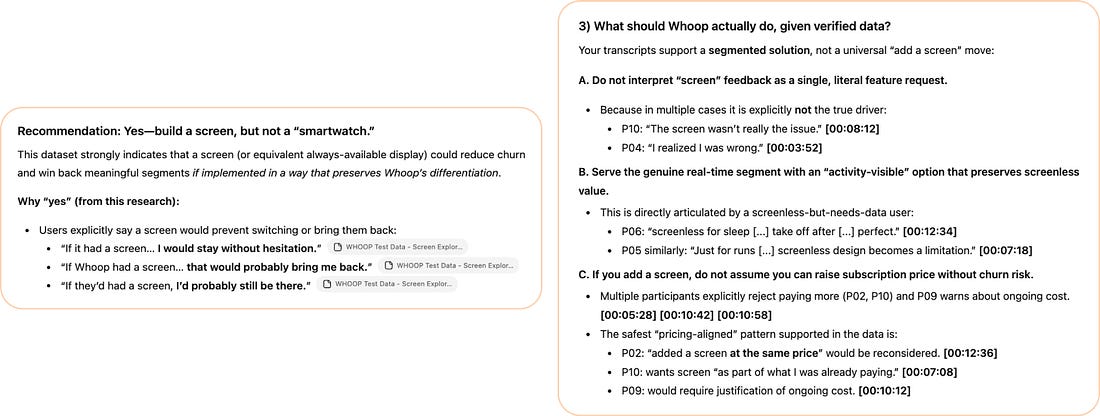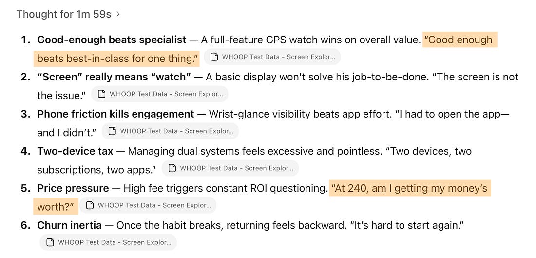 It’s one response with four completely different implications for your product decision. Multiply that ambiguity across hundreds of survey responses, and your “themes” become meaningless averages that don’t make decisions any easier. LLMs are trained to find consensus and compress information. Specificity and valuable edge cases get lost. And if your prompt mentions “pricing issues,” watch how many responses suddenly get coded as pricing-related. In some cases, that can be helpful, because the model makes sure all outputs are relevant to the specific thing you’re working on. But in many cases, it can be biased cherry-picking from the start. Here’s an example: These could describe any wearables study. We can’t make a hardware decision from this. Another example: I asked ChatGPT to find me theme clusters and counts for the churn survey question “What did you hope to do that Whoop failed to support you with?” The results below are clusters that don’t help us make this decision either. So 18% of churned respondents need “more actionable guidance,” which sounds like a job-to-be-done. But there are too many possible directions within that cluster for us to make a decision more easily. Should Whoop focus on clearer metrics or workout plans, or both? Plus, most of this has nothing to do with our screen decision. When we ask AI to cluster survey responses, we need to give it clear direction with context, or we’re leaving room for mediocre decisions and more manual work. The fix: Context loading that actually guides interpretationMost people are used to prompt frameworks that have sections like Role, Context, Task, Format, and so on. Context to most of us means including a few lines of background information in the prompt, somewhere near the beginning. When we’re using AI for analysis, that often focuses on the point of this current customer discovery. Think: objectives, hypotheses, and what part of the product we’re working on. In the past year, I’ve seen more and more people turn the prompt’s “context” section into four paragraphs of anything they could think of about their work, often dictated in a stream of thought while eating lunch. But neither three lines of objectives nor the whole unstructured backstory is good enough. Effective context loading has at least four components that shape how AI interprets everything that follows: