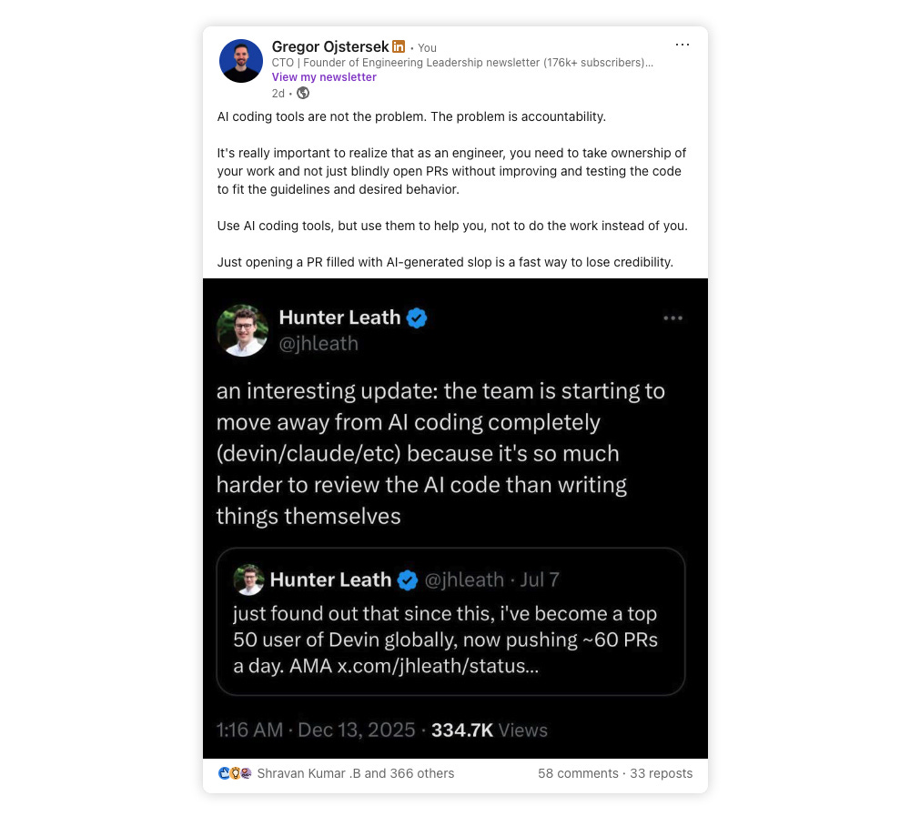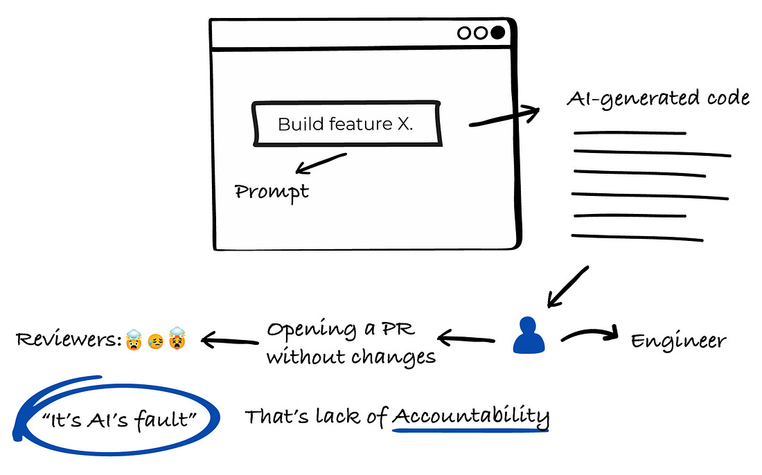 Hey, Gregor here 👋 This is a free edition of the Engineering Leadership newsletter. Every week, I share 2 articles → Wednesday’s paid edition and Sunday’s free edition, with a goal to make you a great engineering leader! Consider upgrading your account for the full experience here. AI Coding Tools Are Not the Problem, Lack of Accountability IsJust opening a PR without checking AI-generated code is not an issue with AI, it's an accountability issue!This week’s newsletter is sponsored by Tinybird. To share what we’ve learned over the last 5+ years running petabyte-sized clusters, we built a free course on ClickHouse®, the underlying database we use in Tinybird. Tinybird helps companies like Vercel, Canva, and Framer query billions of rows in milliseconds, powering instant analytics and real-time user experiences. The course is designed for developers who want to master the basics and build faster, smarter data products with production-ready skills. Thanks to Tinybird for sponsoring this newsletter, let’s get back to this week’s thought! IntroToday’s topic is something I have on my mind for quite a while now, and I’m seeing quite a few engineers making this mistake across the industry. And that mistake is: