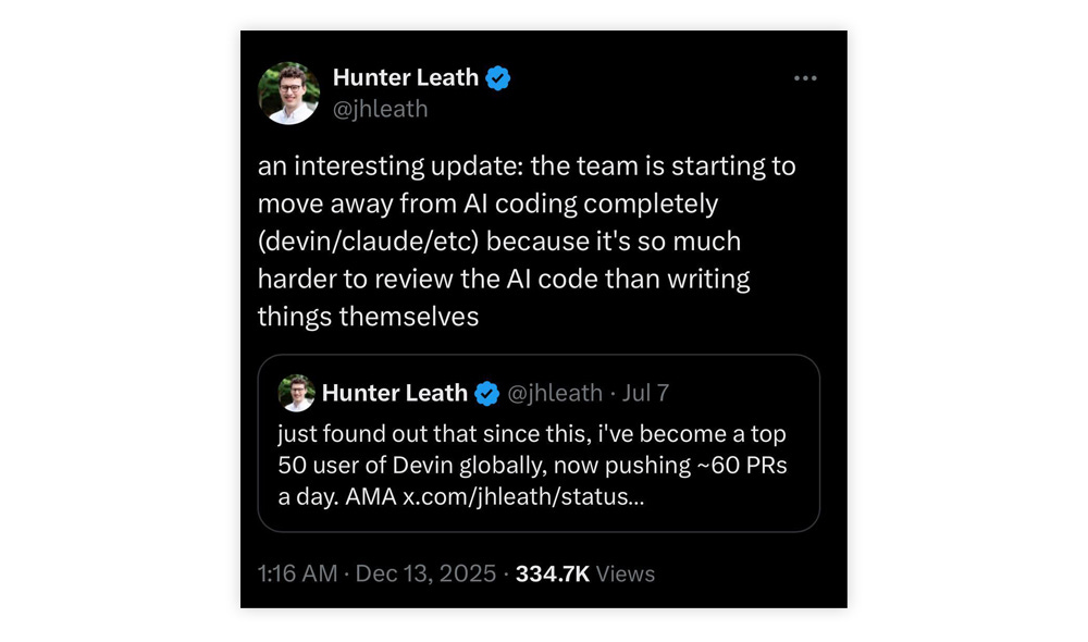 These two points are completely different radical sides. The first one is complete “vibe coding”, and the second one is completely not using AI anymore. Where in reality, the best case is the middle route, which is AI-Assisted Engineering. I have shared my opinion in this post: