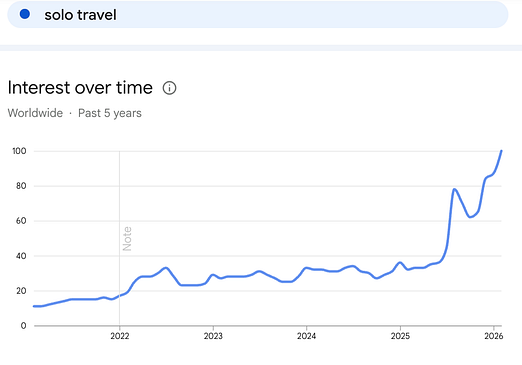 If you want a grounded view of how investors are pricing travel tech, who is buying what, and where capital is flowing within the stack, this deck is worth reading. 9. Solo travel seems to be more than a “trend”Google searches for “solo travel” were flat from 2021 through 2024. Then something shifted. Starting in late 2024, interest spiked, and by early 2026, searches hit record highs. The spike maps to a deeper behavioral shift. There has been an uptick in time spent alone, particularly among younger people, though it is present in all age groups (see first image below). Activities done alone (such as gaming, social media, eating and drinking…) have surged. Social activities like walking with others or playing with children have declined (see second image below). ![]() The first chart shows time spent alone increasing across age groups. The second one highlights the rise in solo activities and the decline in social ones. Source: Contrary Lennart Dobravsky recently highlighted a striking data point: 29% of US households now consist of just one person, the highest share ever recorded, according to Apollo Global Management. That's 40 million Americans living alone. The travel industry has not paid enough attention to this structural change. Solo travelers don’t need “singles cruises” or awkward mixer events. They need pricing that doesn’t penalize them, booking flows that don’t assume a “+1”, experiences that are also designed for one and restaurants that don't relegate them to the worst table by the kitchen or serve only shareable plates. 8. Travel tech job market insights 2025I analyzed more than 10,000 active roles and thousands of candidate clicks and applications from the Travel Tech Essentialist job board. For this analysis, “engagement” refers to candidate actions on listings, primarily clicks and applications. A few clear patterns emerged: